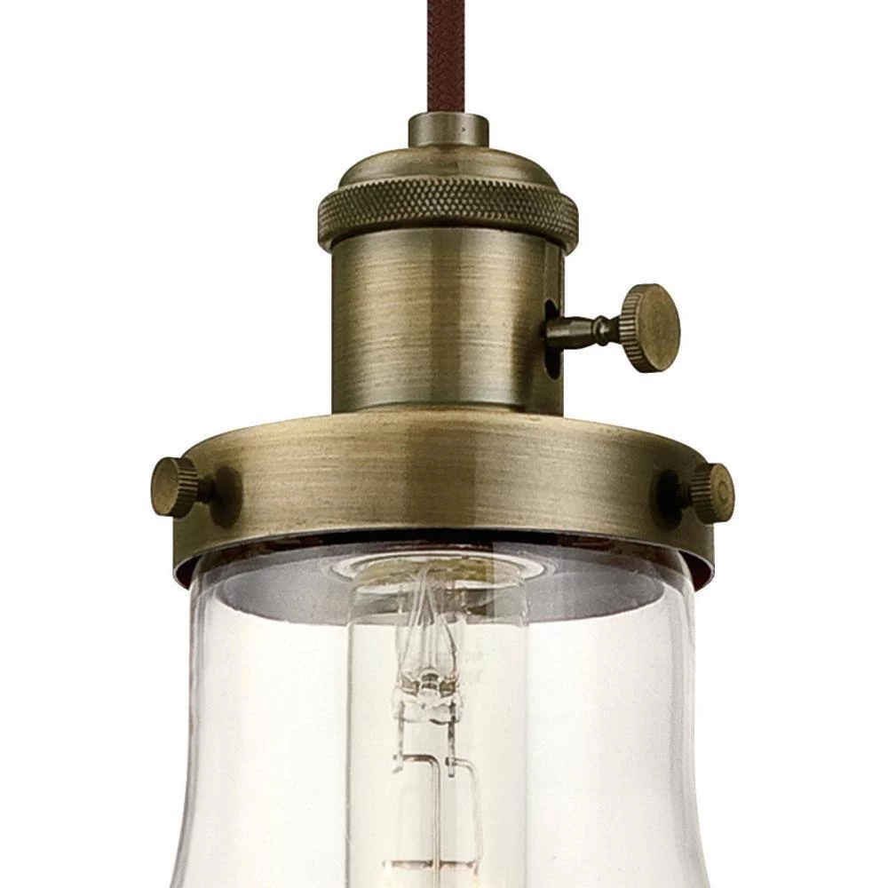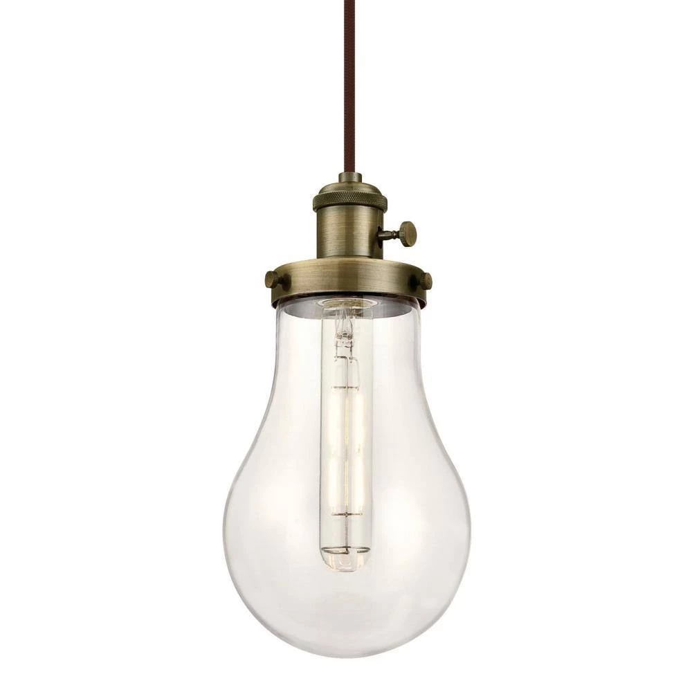 - Antique brass mini pendant with hand blown clear teardrop glass adds vintage style