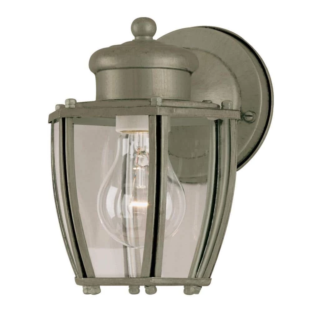This traditionally styled Westinghouse exterior wall lantern features durable steel construction, an antique silver finish, and clear curved glass panels. This light fixture mounts easily to any outdoor wall and is ideal for porches and entryways. The lantern is 7-3/4 in. x 6 in. (H x W) and extends 6-1/2 in. from the wall. It is 2-1/4 in. H from the center of the outlet box, and its round back plate has a 4-1/2 in. Dia. It uses 1 medium-base light bulb, 100-Watt maximum (not included). This Westinghouse exterior wall lantern is UL listed for safety. It is backed by a 5-year manufacturer’s warranty against defects in materials and workmanship.