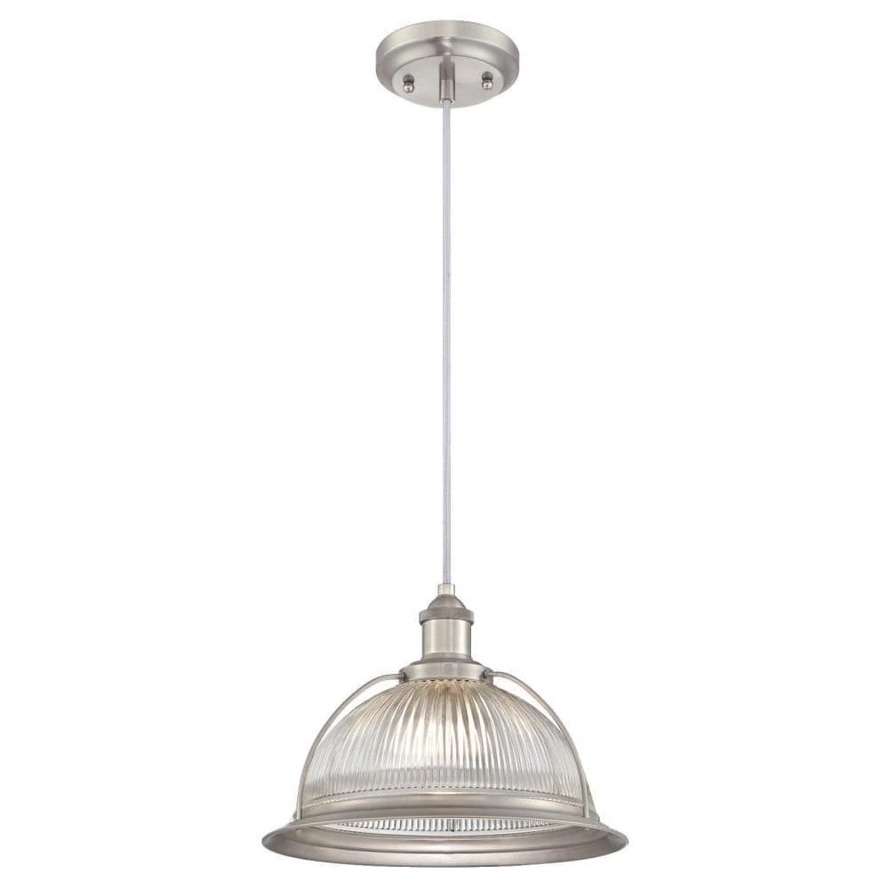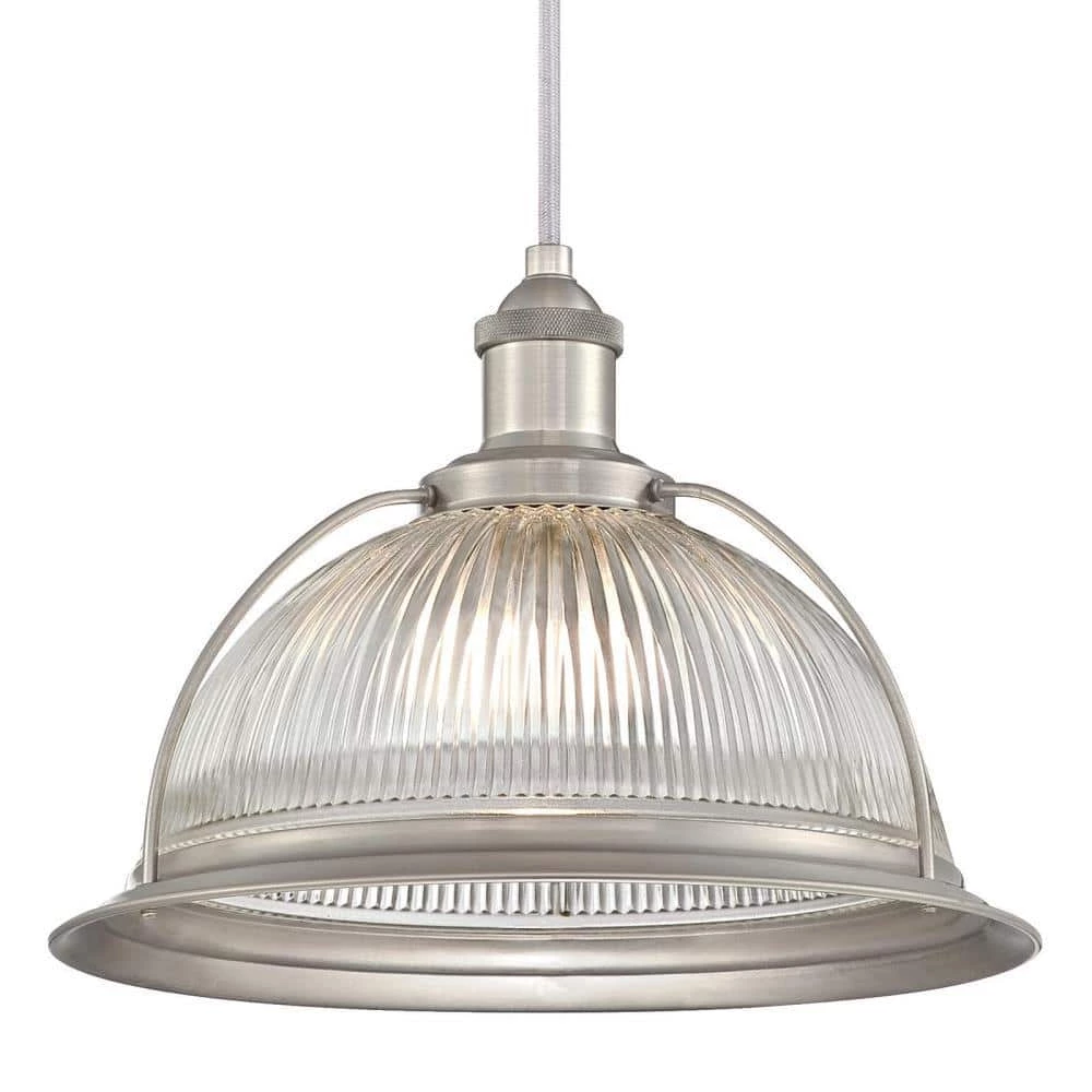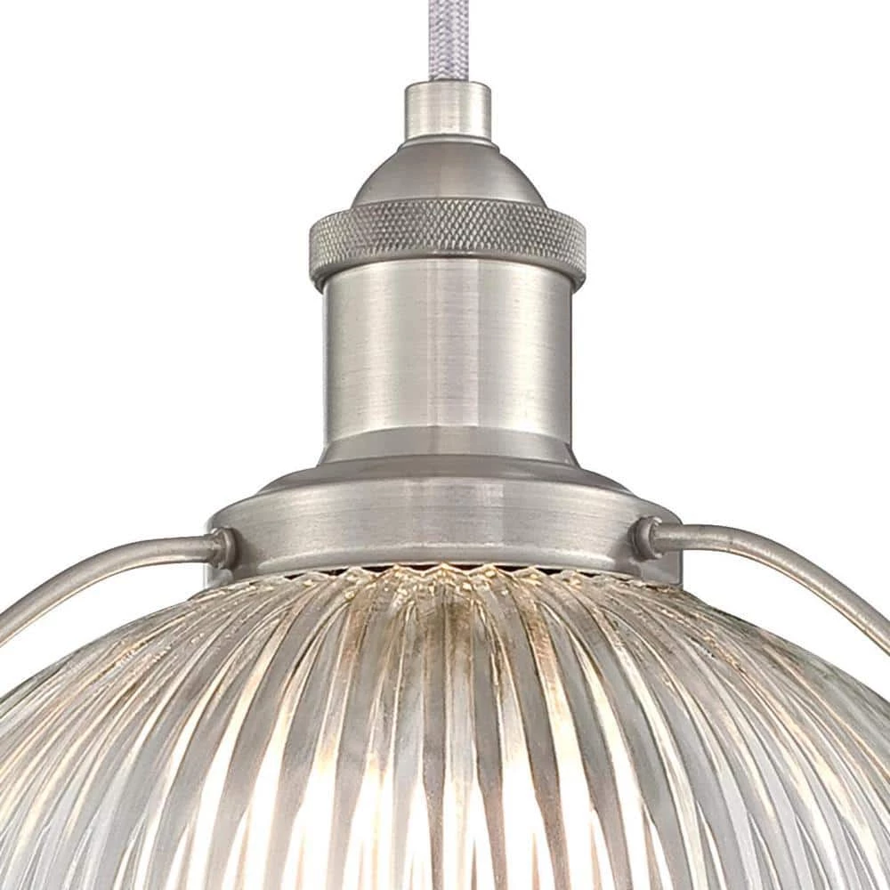 - Brushed nickel pendant with clear ribbed glass shade adds vintage appeal
