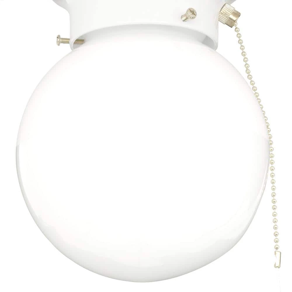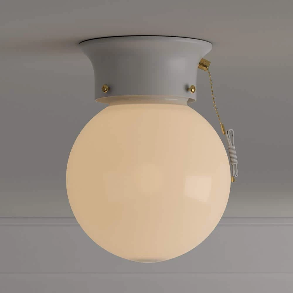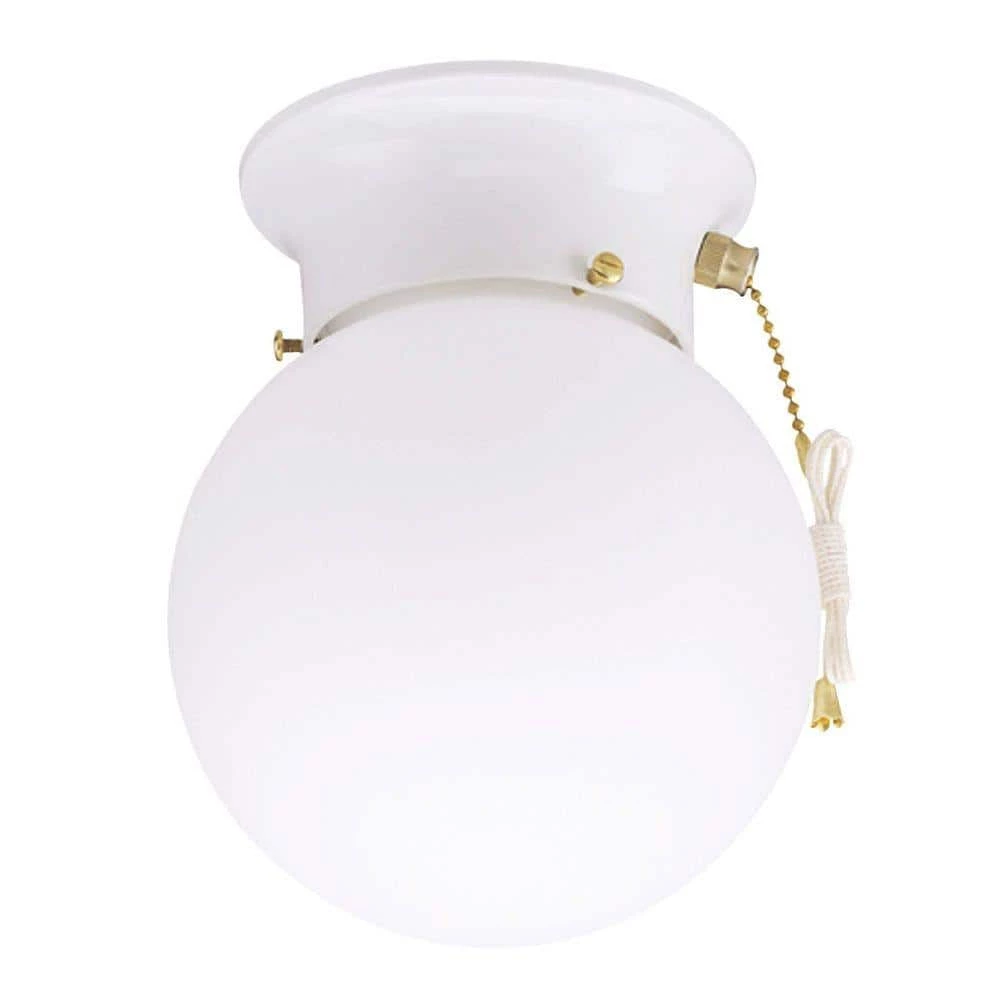 With a simple design, this Westinghouse 1-light flush-mount interior ceiling fixture offers ample light and a pleasing look. The white finish has a minimal style that complements any surrounding, while the white glass globe provides even illumination. The fixture has a flush-mount design that makes it suited to low- and height-ceilinged rooms alike. It also includes a pull chain for easy access when there are no light switches handy. The light fixture is 7-1/4 in. H x 6 in. in diameter. It uses 1 medium-base light bulb, 60-Watt maximum (not included). The fixture’s compact design makes it ideal for smaller spaces. This Westinghouse interior light fixture is UL listed for safety. It is backed by a 5-year manufacturer’s warranty against defects in materials and workmanship.