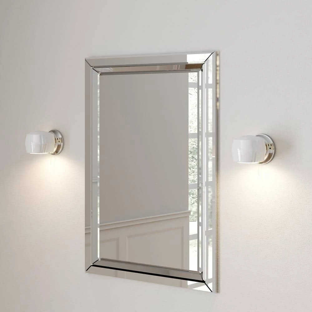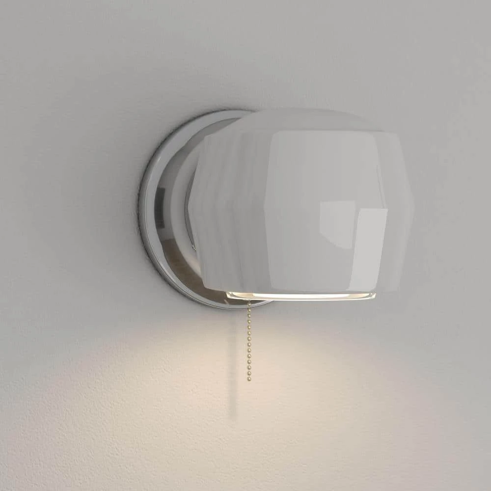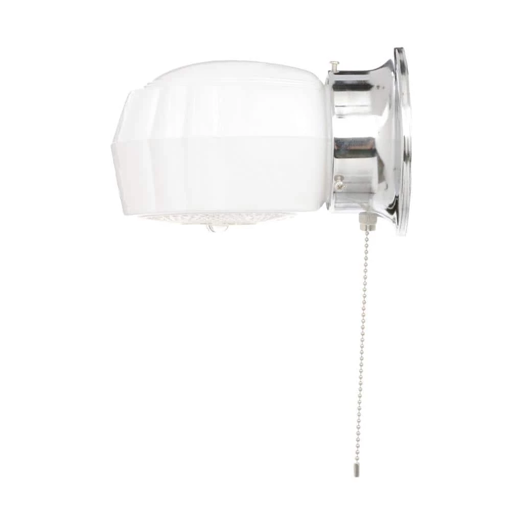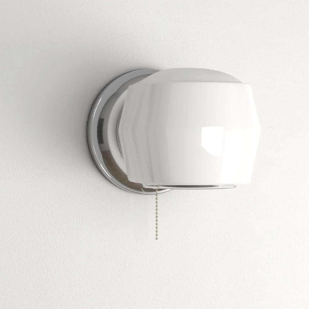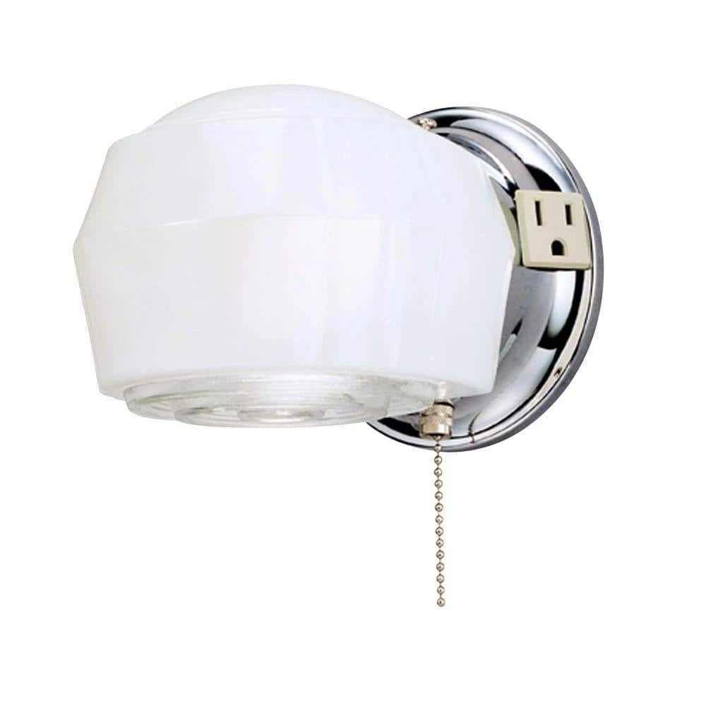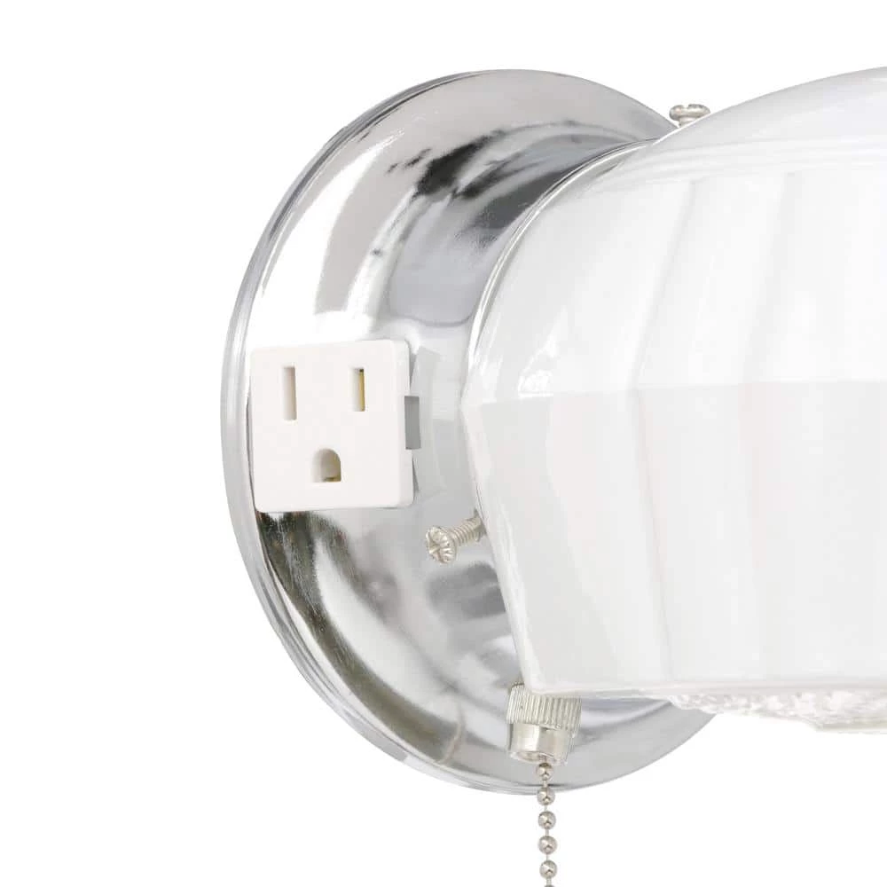 This simple Westinghouse 1-light interior wall fixture was designed for function and practicality. It features a convenient ground outlet and pull chain when most others do not. The fixture also boasts a compact, low-profile design–it will fit easily in even your smallest rooms. The chrome finish base has a versatile aesthetic, and the white and crystal glass filters even light. The fixture’s extra outlet is of great utility whether you are using a wet/dry vac in the garage or a hair dryer in the bathroom. The fixture is 4-1/2 in. x 5-1/4 in. (H x W) and extends 6-1/2 in. from the wall. It uses 1 medium-base light bulb, 60-Watt maximum (not included). This Westinghouse interior wall fixture is UL listed for safety. It is backed by a 5-year manufacturer’s warranty against defects in materials and workmanship.