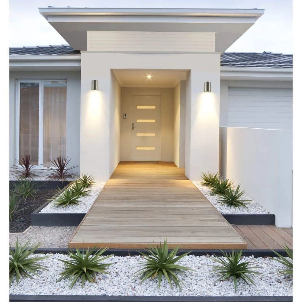 This Westinghouse outdoor wall fixture features sleek mid-century modern design, with a polished graphite finish on a steel cylinder. This fixture also features a clean rectangular back plate that contrasts nicely with the rounded body of the fixture. Install this modern wall fixture in your front or back entryway, or by your garage door, deck area, patio, balcony, or side entrance. Wherever you mount it, you will enjoy the fixture’s indirect light and clean lines. The fixture is 7 in. x 4-1/2 in. (H x W), and it extends 7-7/8 in. from the wall. It is 2-3/4 in. H from the center of the outlet box. The back plate measures 5 in. x 4-1/4 in. (H x W). This Westinghouse wall fixture is UL/CUL listed for safety. It is backed by a 5-year limited warranty against defects in materials and workmanship. Product reference number 67973.