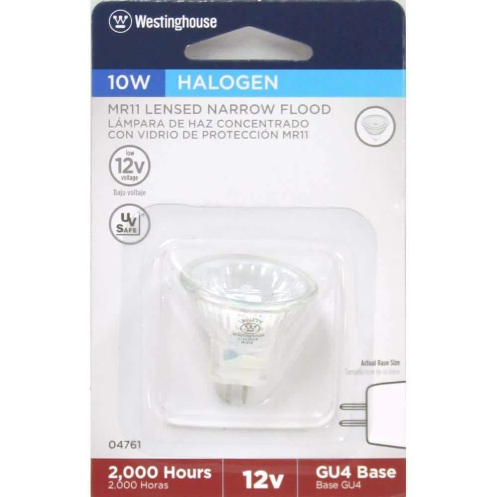 The Westinghouse 10-Watt MR11 Low Voltage Clear Lens Halogen Light Bulb includes a GU4 base ideal for pendant, recessed lighting fixtures, and landscape lighting. Featuring bright white light, this halogen light is a cost-effective and low-energy option for home, office and outdoors. Westinghouse is a global brand with a simple philosophy: make life easier for everyone who buys its products. Westinghouse products are designed for exceptional quality, reliability, and functionality. Product reference number 04761.