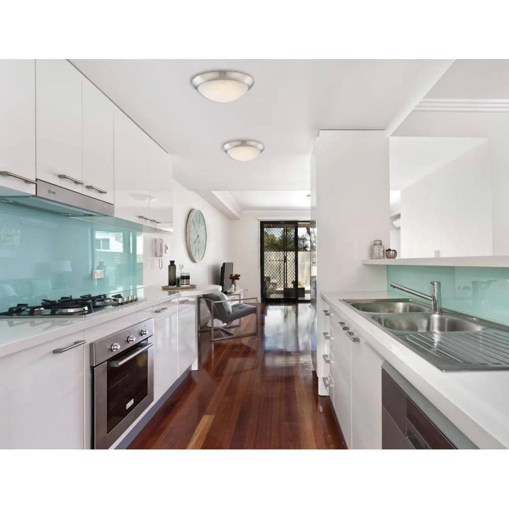 The Westinghouse 11 in. Ceiling Fixture combines LED technology with a traditional sleek design. The luxurious brushed nickel finish adds a perfect finishing touch to this fixture and the white alabaster glass filters the light for beautiful illumination. The 16-Watt integrated LED in this fixture will provide beautiful ambient light for 27 years and you will never need to replace a single bulb. This sleek ceiling light’s compact size makes it ideal for hallways, laundry rooms or any smaller spaces. The fixture measures 3-7/16 in. x 11 in. (H x D). This Westinghouse indoor ceiling fixture is ETL/CETL listed for safety. It is backed by a 5-year limited manufacturer’s warranty against defects in materials and workmanship. Westinghouse is a trusted, global brand. Westinghouse knows lighting and offers products with exceptional quality, reliability and functionality. Product reference number 63088.