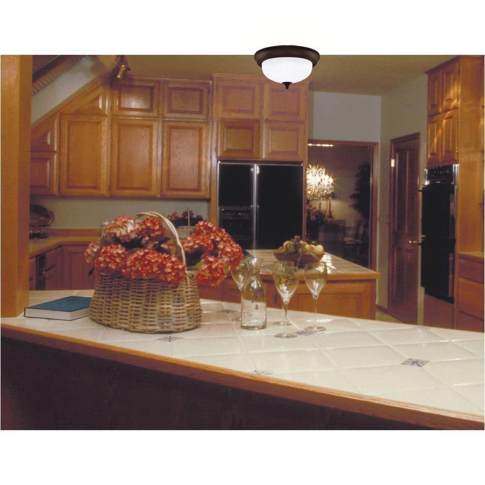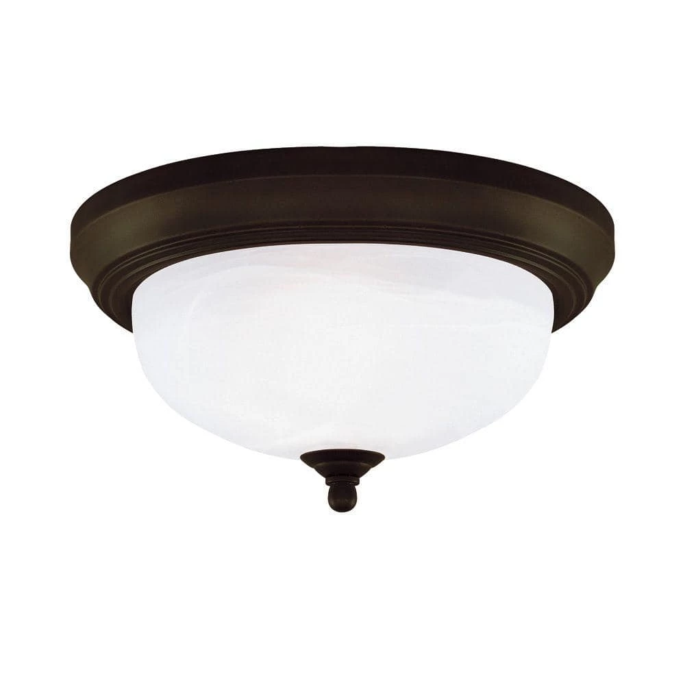 This Westinghouse 2-light ceiling fixture is defined by its simple elegance. The sophisticated oil rubbed bronze finish contrasts handsomely with frosted white alabaster glass. The shade filters an even light, and its flush-mount design allows it to work equally well with low or high ceilings. No matter where you place it, you will enjoy the commanding presence this fixture lends to your interior decor. The fixture is 5-7/8 in. high x 13 in. Dia. Backed by a 5-year limited manufacturer’s warranty against defects in materials and workmanship. Westinghouse is a trusted, global brand. Westinghouse knows lighting and offers products with exceptional quality, reliability and functionality. Product reference number 64291.