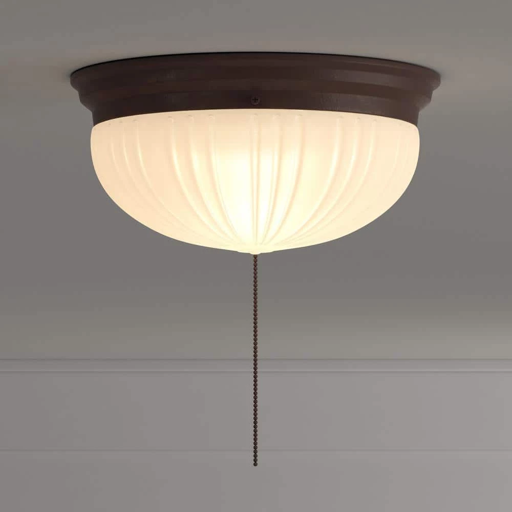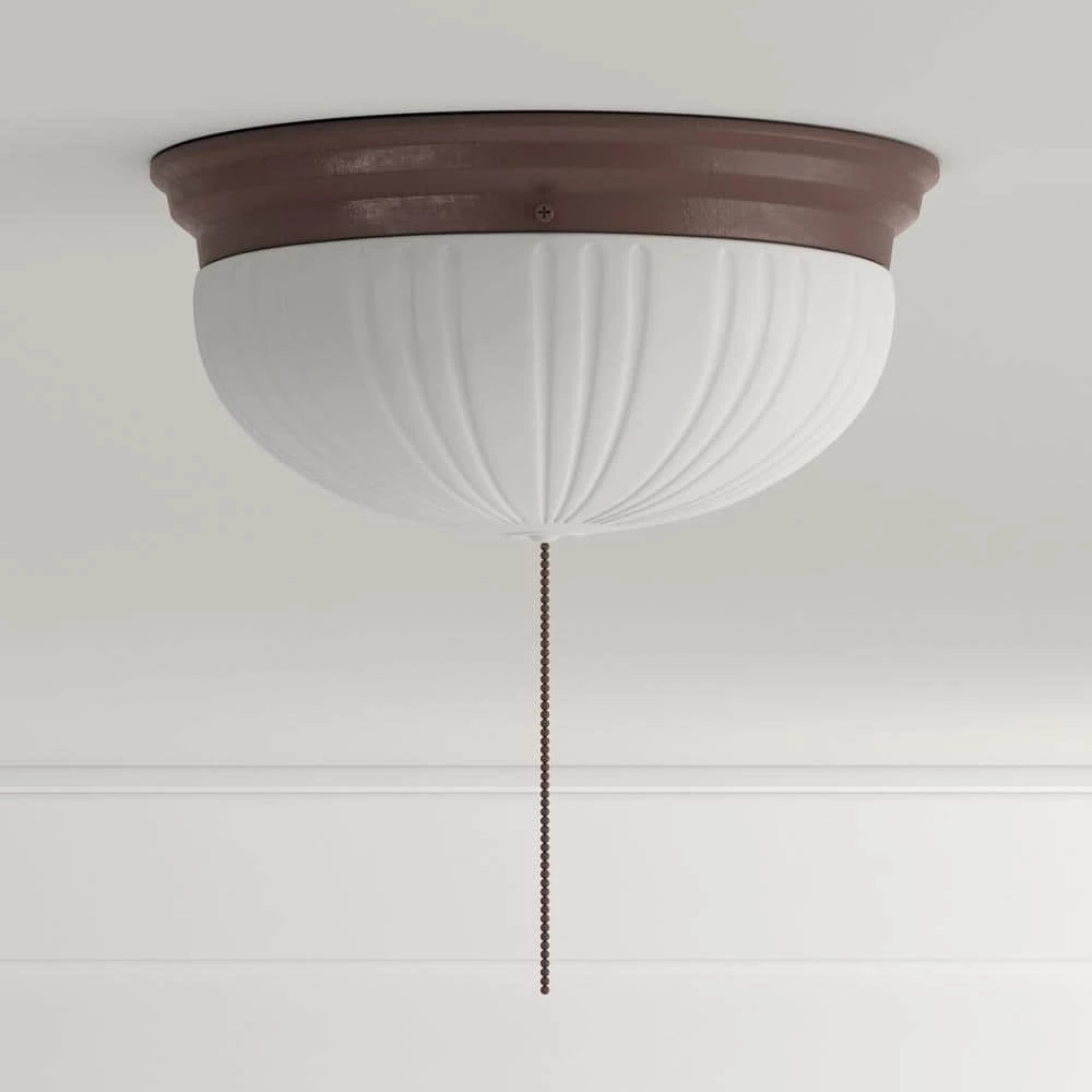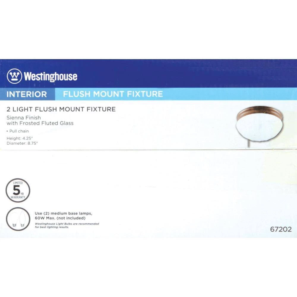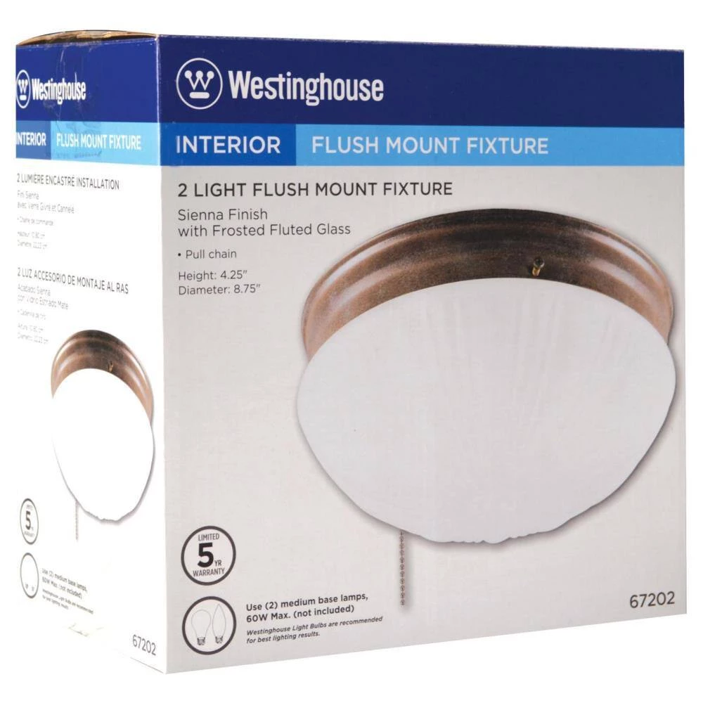 This Westinghouse 2-light ceiling fixture features a sienna finish. The frosted fluted glass provides soft illumination. Perfect for areas without a light switch, the fixture includes a pull chain for easy operation. Install this light fixture in your entryway, kitchen, or bedroom. The versatile flush-mount makes it well suited for low ceilings. Wherever you mount it, you will enjoy the fixture’s soft light and traditional look. The fixture is 4-1/4 in. high x 8-3/4 in. in diameter. Backed by a 5-year limited manufacturer’s warranty against defects in materials and workmanship. Westinghouse is a trusted, global brand. Westinghouse knows lighting and offers products with exceptional quality, reliability and functionality. Product reference number 67202.