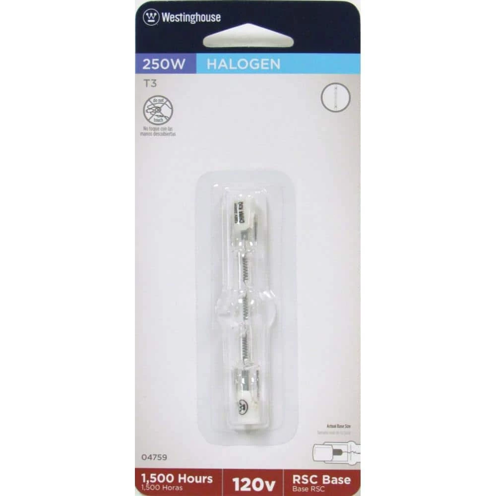 The Westinghouse 250-Watt T3 Double-Ended Clear Halogen Light Bulb provides bright white light perfect for the home, workplace or other general uses. These light bulbs are a cost-effective alternative to standard light bulbs and a completely dimmable in multiple lighting applications. Westinghouse is a global brand with a simple philosophy: make life easier for everyone who buys its products. Westinghouse products are designed for exceptional quality, reliability, and functionality. Product reference number 04759.