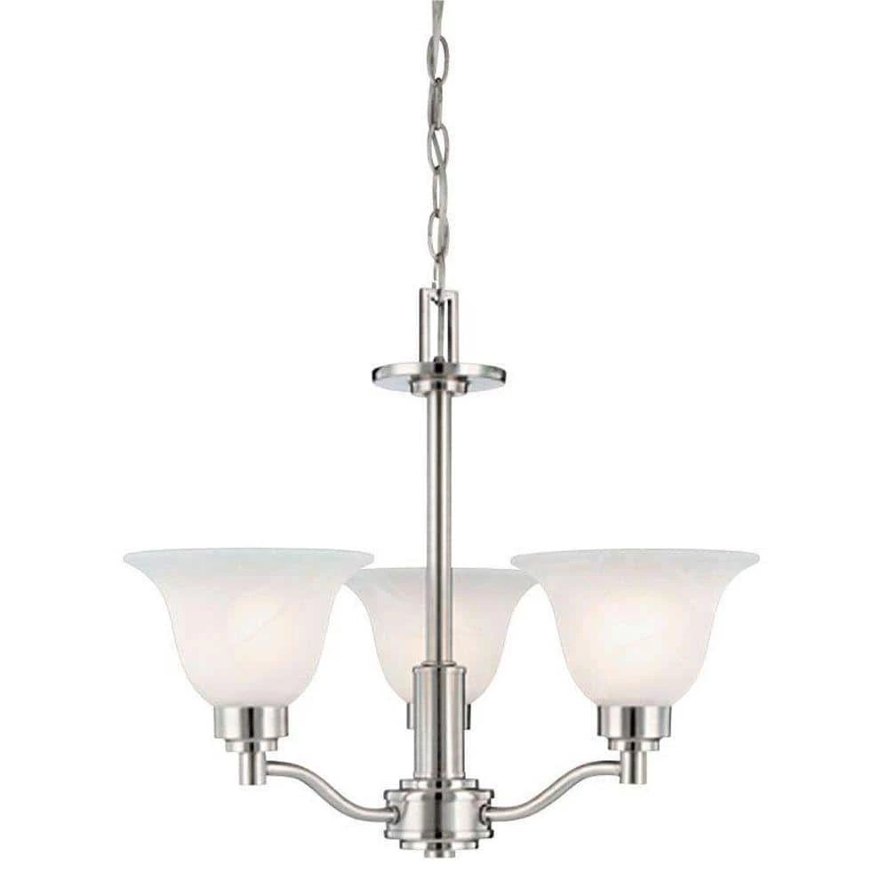 This Westinghouse 3-light interior chandelier features a brushed nickel finish on a slender, tubular base for striking refinement. Atop outstretched support arms, frosted white alabaster glass creates a soft, inviting glow. Install this fixture in your foyer, kitchen, or dining room. The chain mount makes it ideal for high ceilings. Wherever you place it, you will enjoy the fixture’s soft light and traditional look. The fixture is 17-3/8 in. x 19-1/2 in. (H x W) and includes a 108 in. chain and 120 in. electrical wire. It uses 3 medium-base light bulbs, 60-Watt maximum (not included). This Westinghouse interior hanging fixture is UL listed for safety. It is backed by a 5-year manufacturer’s warranty against defects in materials and workmanship.
