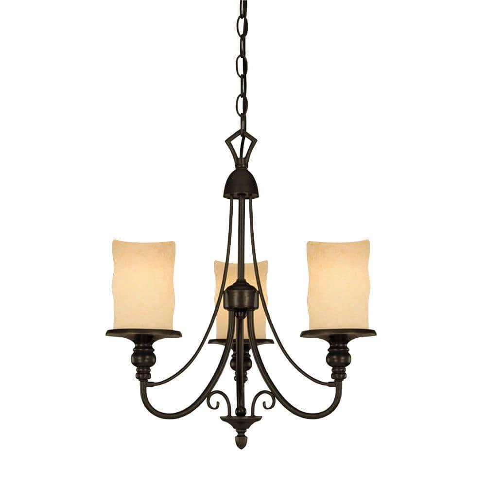 This Westinghouse 3-light interior chandelier features a burnished bronze patina finish on a cascading base. Long, arcing support arms curve upward to hold a collection of lights. The burnt scavo glass, suggestive of burning candles, provides soft, warm illumination. A finial accent with decorative scrolls adds visual interest. Install this fixture in your foyer, kitchen, or dining room. The chain mount makes it ideal for rooms with high ceilings. Wherever you place it, you will enjoy the fixture’s soft light and artistic look. The fixture is 21-1/2 in. x 19 in. (H x W) and includes a 108 in. chain and 120 in. electrical wire. It uses 3 medium-base light bulbs, 60-Watt maximum (not included). This Westinghouse interior hanging fixture is UL listed for safety. It is backed by a 5-year manufacturer’s warranty against defects in materials and workmanship.