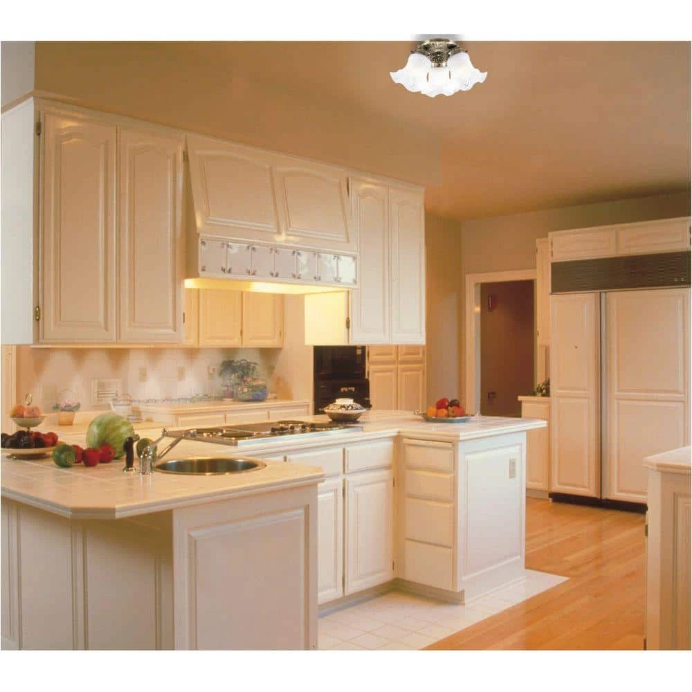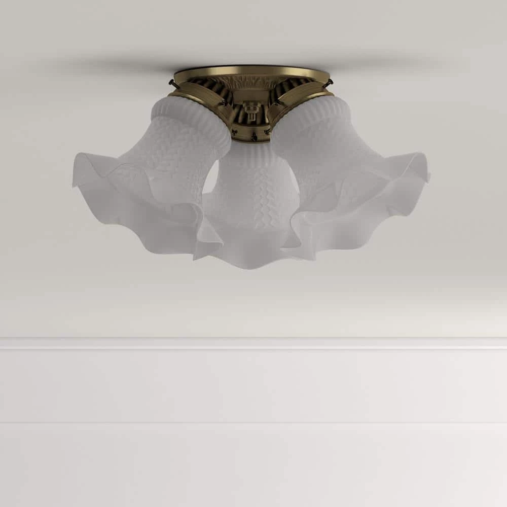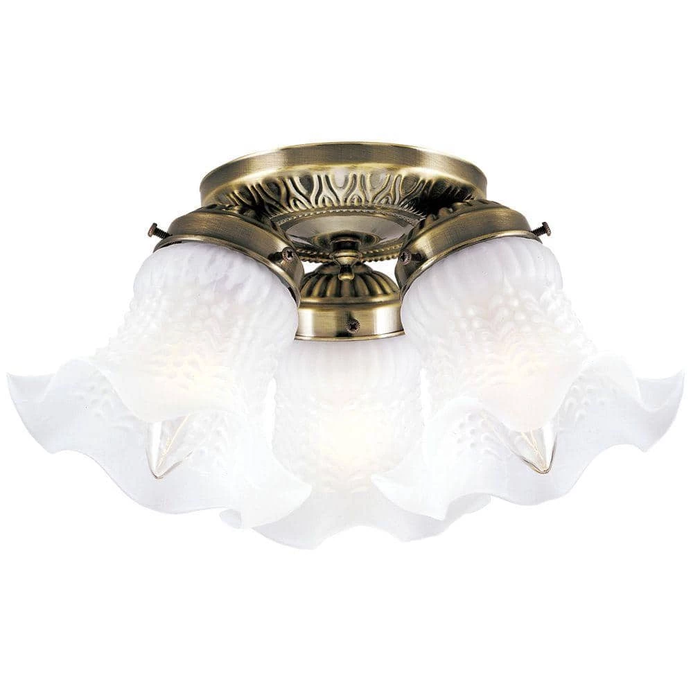 This Westinghouse 3-light ceiling fixture features an antique brass finish on a circular base with embossed detail. The frosted ruffled edge glass, embellished with intricate texture, adds an attractive floral accent. Install this decorative fixture in your family room, hallway, or bedroom. The versatile flush-mount makes it well suited for low ceilings. Wherever you mount it, you will enjoy the fixture’s bright light and traditional look. The fixture is 5-5/8 in. x 11 in. (H x W). Backed by a 5-year limited manufacturer’s warranty against defects in materials and workmanship. Westinghouse is a trusted, global brand. Westinghouse knows lighting and offers products with exceptional quality, reliability and functionality. Product reference number 66686.