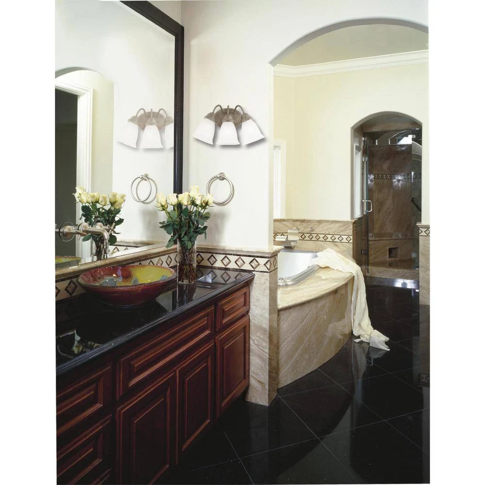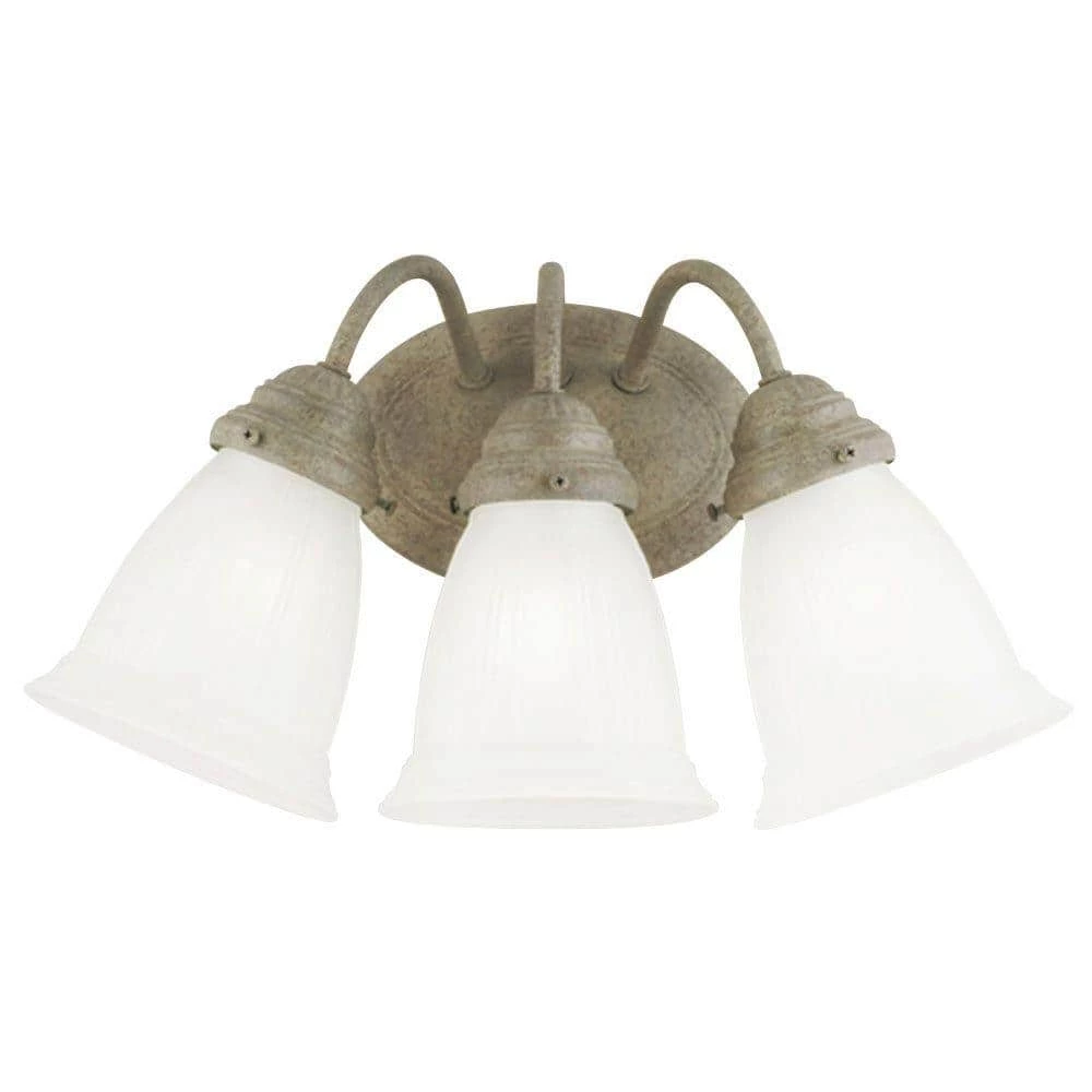 This Westinghouse 3-Light Interior Wall Fixture has a streamlined appearance and cobblestone finish that will coordinate with most decors. An oval back plate and slender curved arms complement the bell-shaped frosted glass. No matter where you place it, you will appreciate the style and glow this fixture adds to your space. The fixture is 8-1/4 in. x 17 in. (H x W) and extends 7-7/8 in. from the wall. It uses 3 medium-base light bulbs, 100-Watt maximum (not included). You can mount the fixture up or down to suit your needs. This Westinghouse interior fixture is UL listed for safety. It is backed by a 5-year manufacturer’s warranty against defects in materials and workmanship.