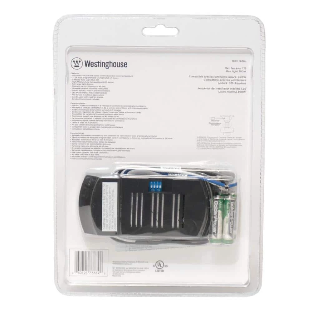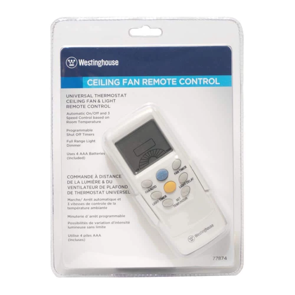 The Westinghouse Thermostat Ceiling Fan and Light Remote Control automatically turns your fan on and off and sets the fan speed based on room temperature. It features 3 fan speeds (high/medium/low) and includes a full-range light dimmer. For added convenience, timers allow you to separately set the fan and light to run anywhere from 30 minutes to 24 hours each, and a room-exit feature turns the light off 3 minutes after you leave the room. This remote control features wireless operation and it can be operated from a distance of up to 40 ft. once the receiver is wired to the fan at the ceiling. The receiver (fits most fans) and the remote uses 4 AAA batteries (not included). CUL US-listed, and compatible with most ceiling fan brands, this 120-volt/60 Hz remote can handle a fan maximum of 1-1/4 amps and a light maximum of 300-Watt. Product reference number 77874.