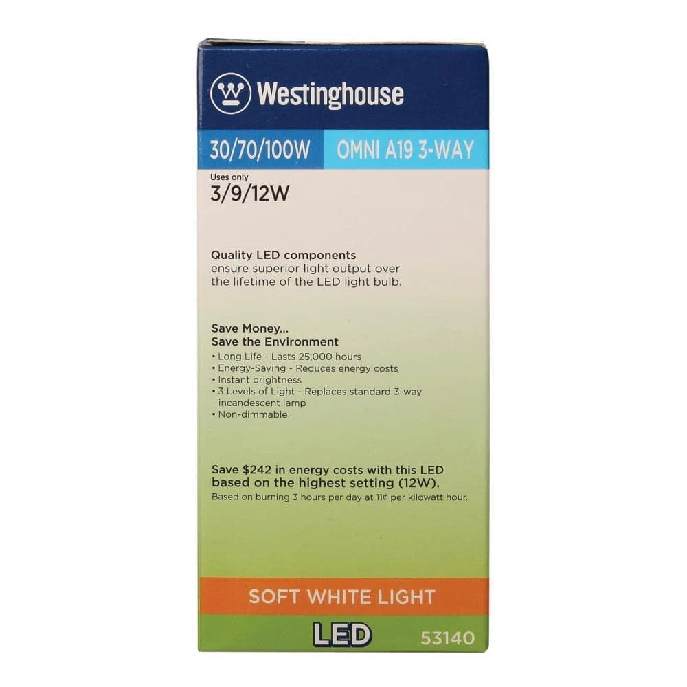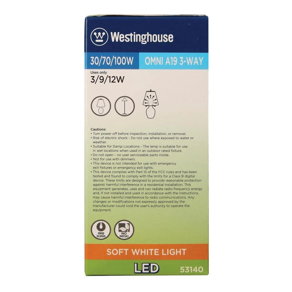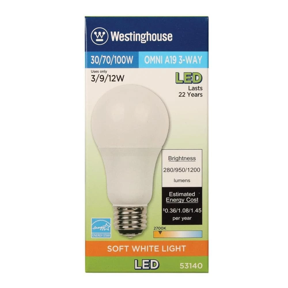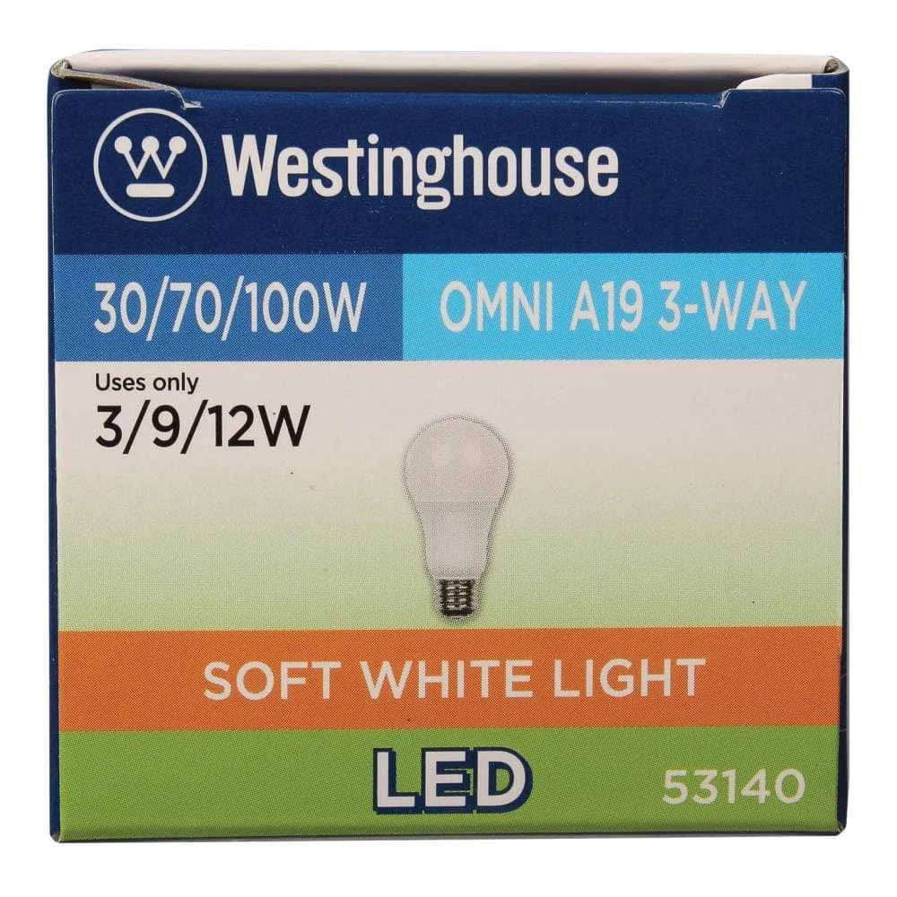 The Westinghouse 3/9/12-Watt Omni A19 3-Way LED Light Bulb is an ideal energy-saving alternative to traditional incandescent 3-way bulbs for use in table and floor lamps. Choose soft relaxing light or brighter light for reading and doing tasks. Suitable for use in enclosed fixtures and damp locations in outdoor-rated fixtures. This ENERGY STAR LED light bulb reduces energy and operating costs. Save up to $242.00 over the lifetime of the bulb compared to a standard 30/70/100-Watt incandescent bulb when used on the highest wattage. Making the switch to Westinghouse LED light bulbs provides significant energy saving benefits. Westinghouse is a trusted, global brand. Westinghouse knows lighting and offers products with exceptional quality, reliability and functionality. Product reference number 53140.