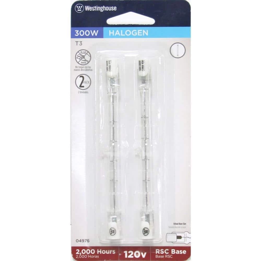 The Westinghouse 300-Watt T3 Double-Ended Clear Halogen Light Bulb 2-Pack provides bright white light perfect for the home, workplace or other general uses. These light bulbs are a cost-effective alternative to standard light bulbs and a completely dimmable in multiple lighting applications. Westinghouse is a global brand with a simple philosophy: make life easier for everyone who buys its products. Westinghouse products are designed for exceptional quality, reliability, and functionality. Product reference number 04976.