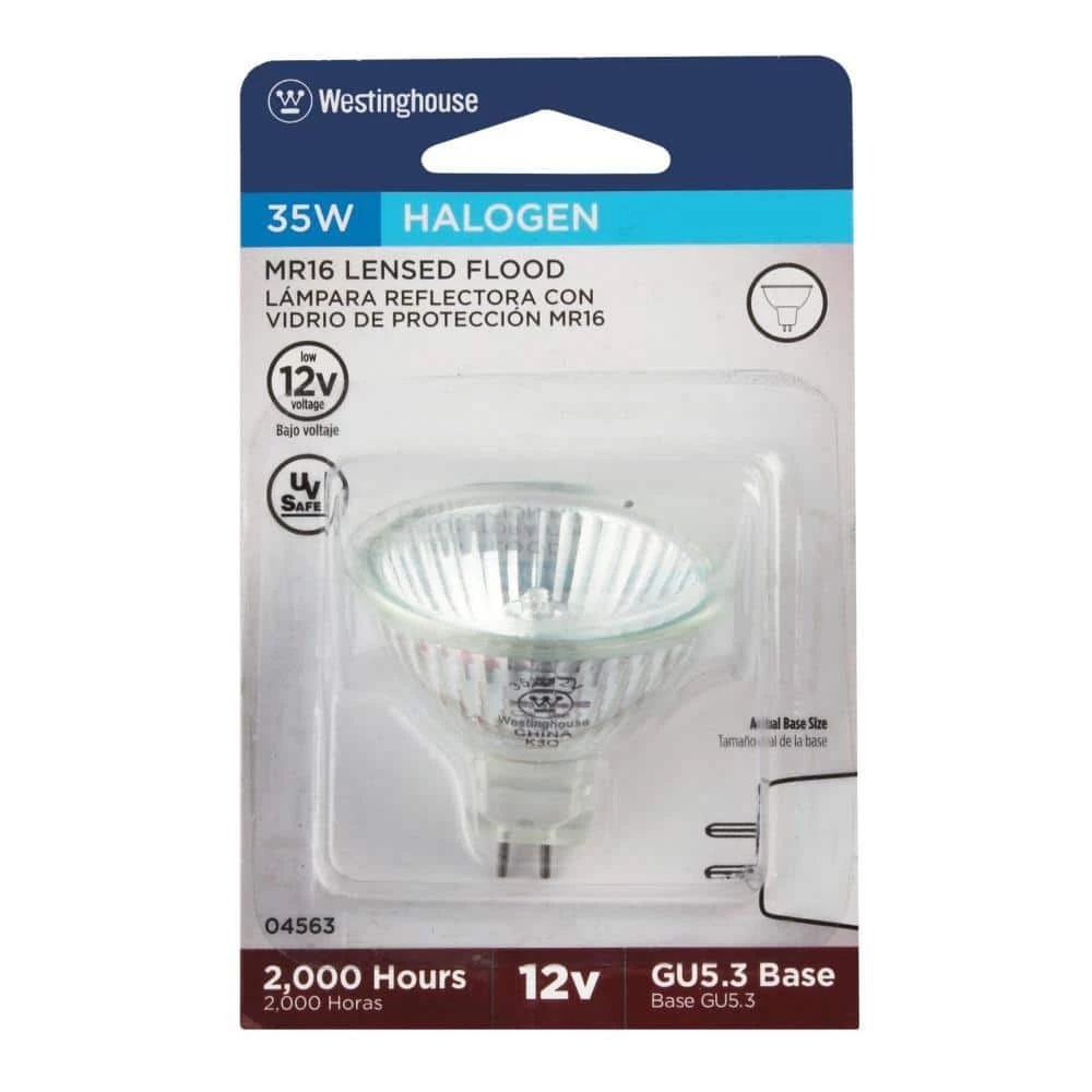 The Westinghouse 35-Watt MR16 Low Voltage Clear Lens Halogen Light Bulb includes a GU5.3 base ideal for pendant and recessed lighting fixtures. Featuring bright white light, this halogen light is a cost-effective and low-energy option for home, office and outdoors. Westinghouse is a global brand with a simple philosophy: make life easier for everyone who buys its products. Westinghouse products are designed for exceptional quality, reliability, and functionality. Product reference number 04563.