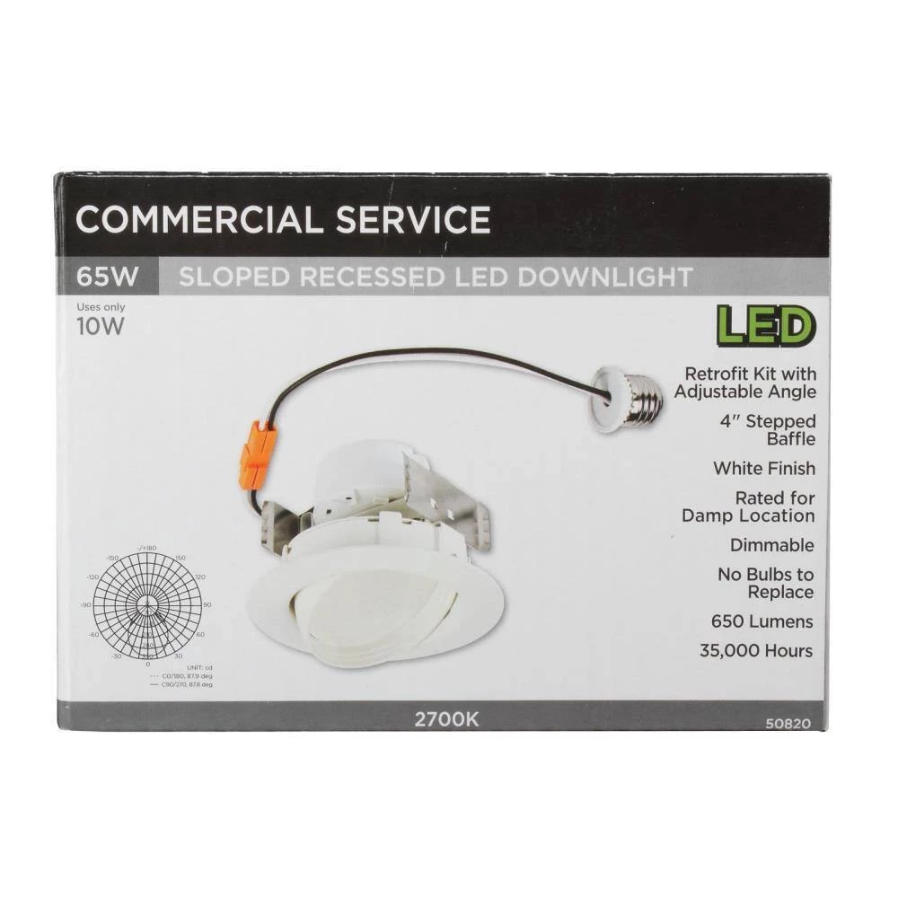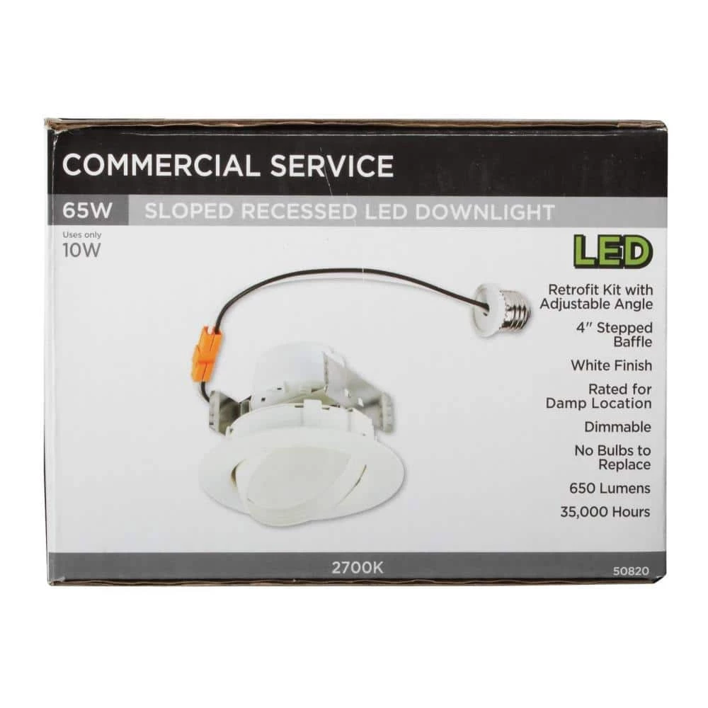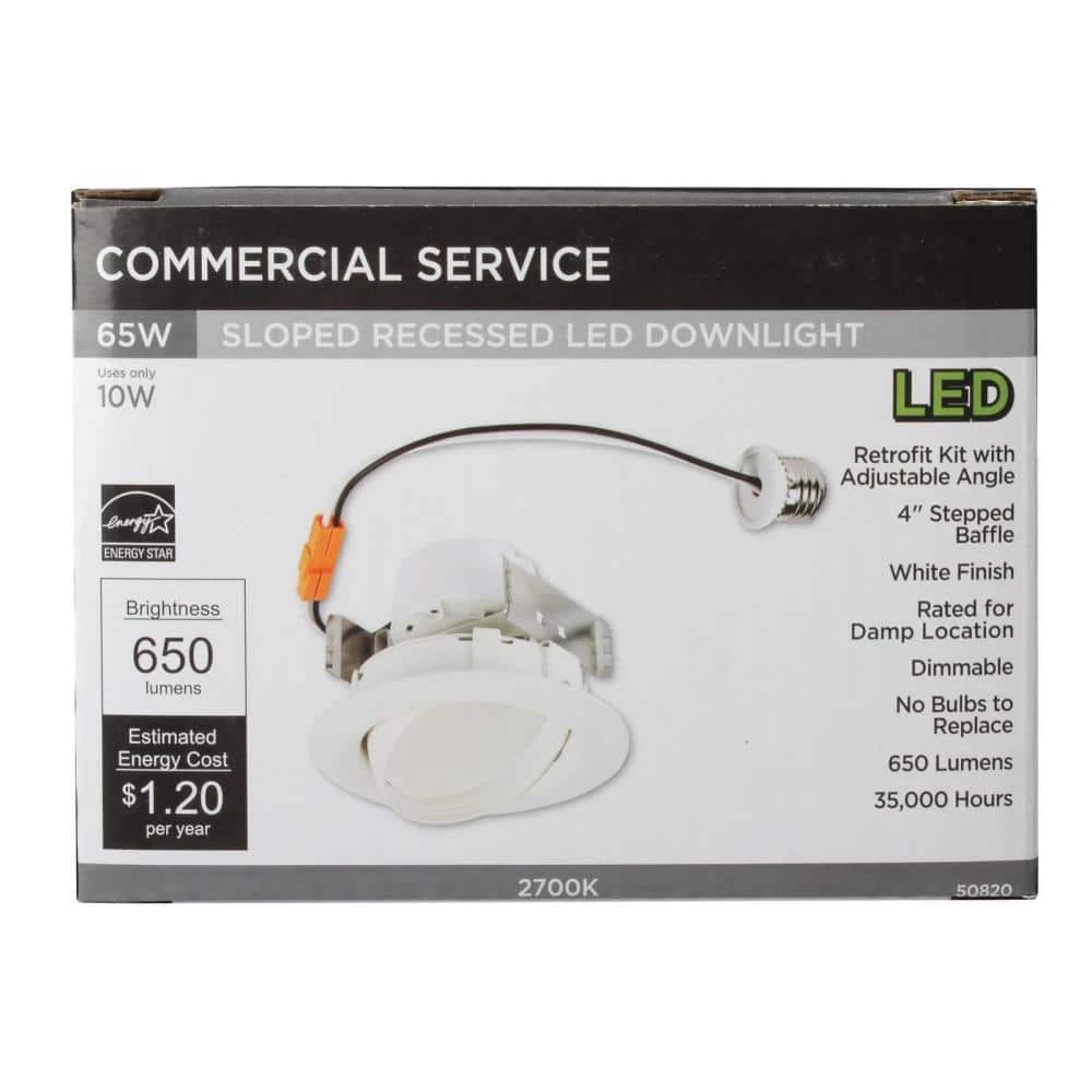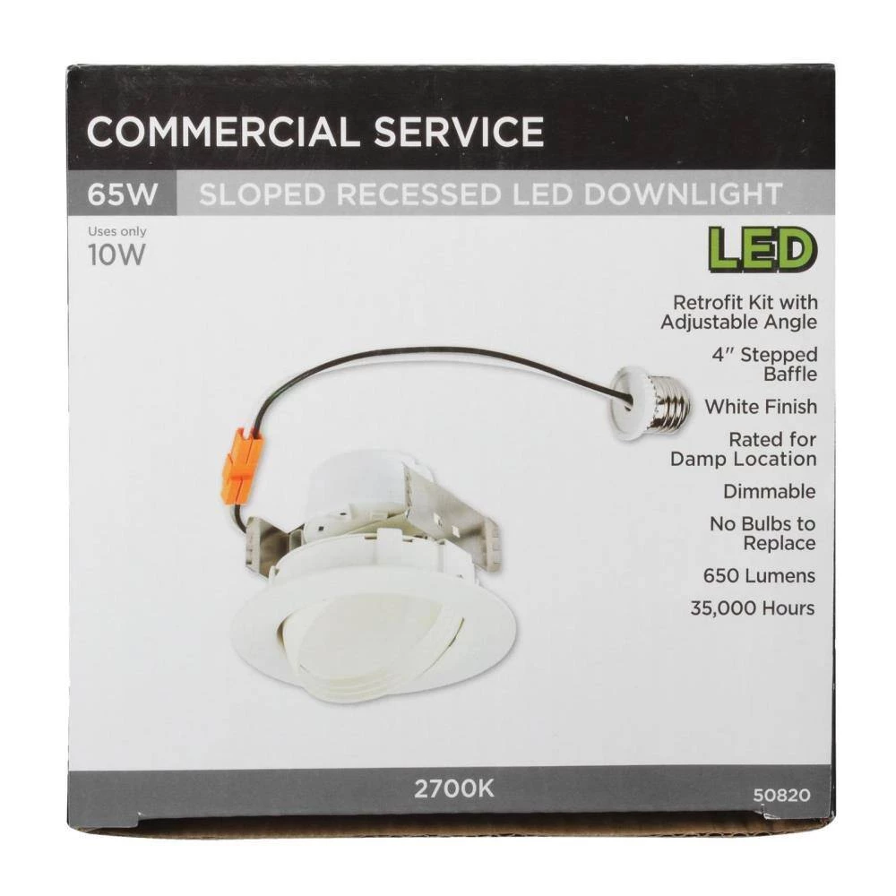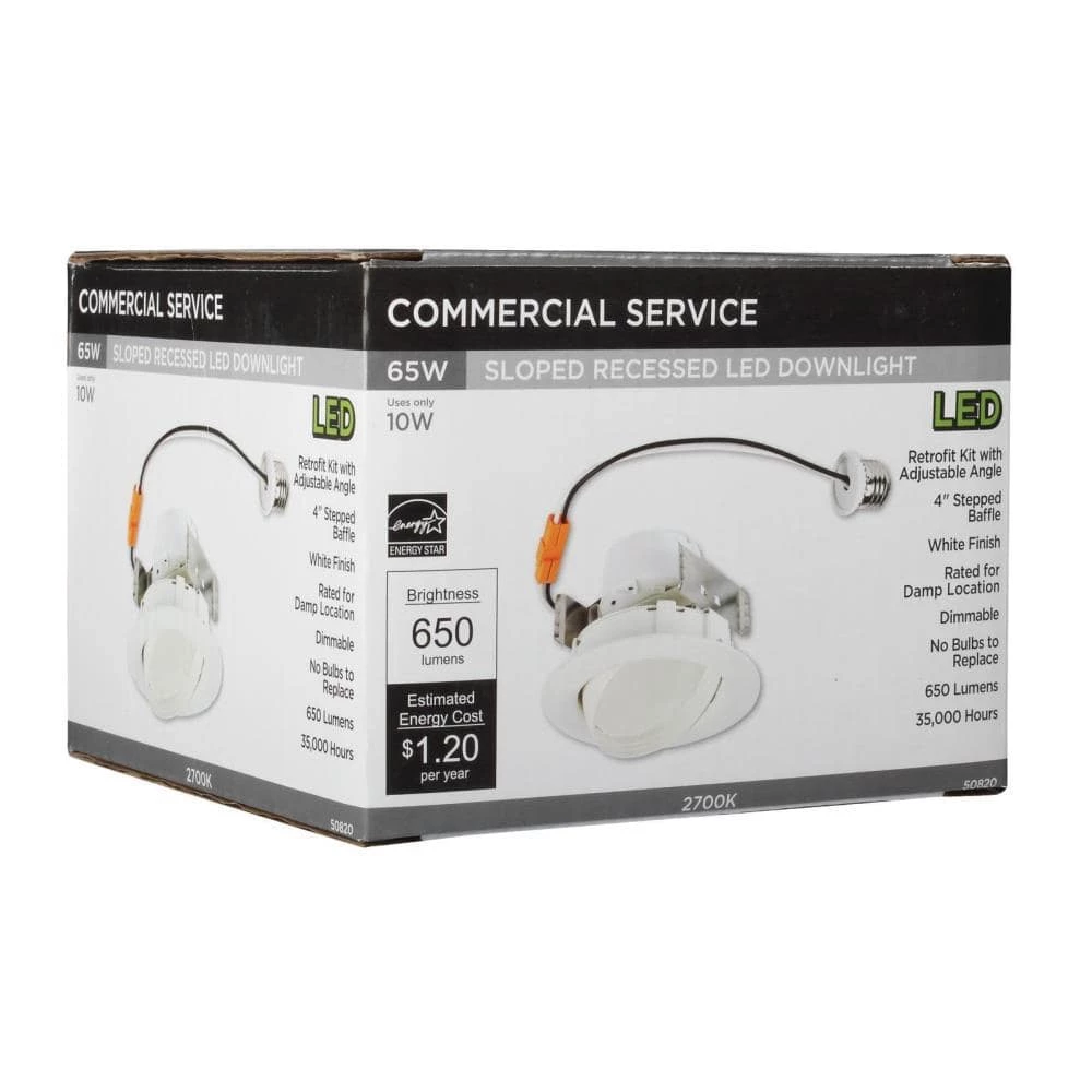 The Westinghouse 10-Watt 2700K ENERGY STAR Dimmable 4 in. Sloped Recessed LED Downlight is perfect for everyday use. The adjustable gimbal ring rotates 355 with up to a 45 degree tilt making it ideal for sloped ceiling applications. Simply replace the bulb in a 4 in. standard recessed housing with this LED downlight for a quick, easy and energy efficient upgrade. Suitable for damp locations, this durable LED light provides long-term use and dependability. Perfect for kitchens, bathrooms, family rooms, offices, retail settings or anywhere recessed lighting is used, this convenient one piece downlight works with existing IC and Non-IC recessed cans that use a medium base socket. All installation hardware is hidden and the pre-attached trim creates a seamless look. Reduce energy costs with this ENERGY STAR LED and save up to 85% over its lifetime when used in place of a standard 65-Watt incandescent. Making the switch to Westinghouse LEDs provides significant energy saving benefits. Westinghouse is a trusted, global brand. Westinghouse knows lighting and offers products with exceptional quality, reliability and functionality. Product reference number 50820.