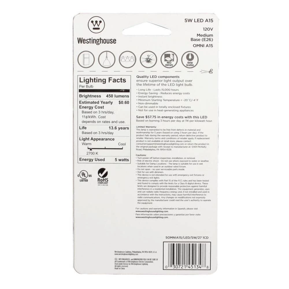 The Westinghouse 5-Watt Omni A15 LED Light Bulb (4-Pack) is designed to look like traditional incandescent light bulbs. The ideal energy-saving replacement light bulb for a variety of applications, from ceiling fans and appliances to enclosed fixtures and outdoor rated wall and post lanterns. Reduce energy costs with this LED and save up to $57.75 over the lifetime of the bulb when used in place of a standard 40-Watt incandescent. Making the switch to Westinghouse LED light bulbs provides significant energy saving benefits. Westinghouse is a trusted, global brand. Westinghouse knows lighting and offers products with exceptional quality, reliability and functionality. Product reference number 45134.