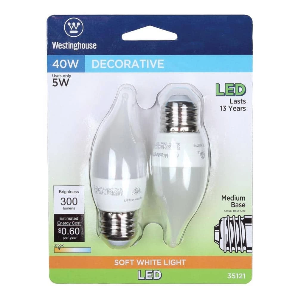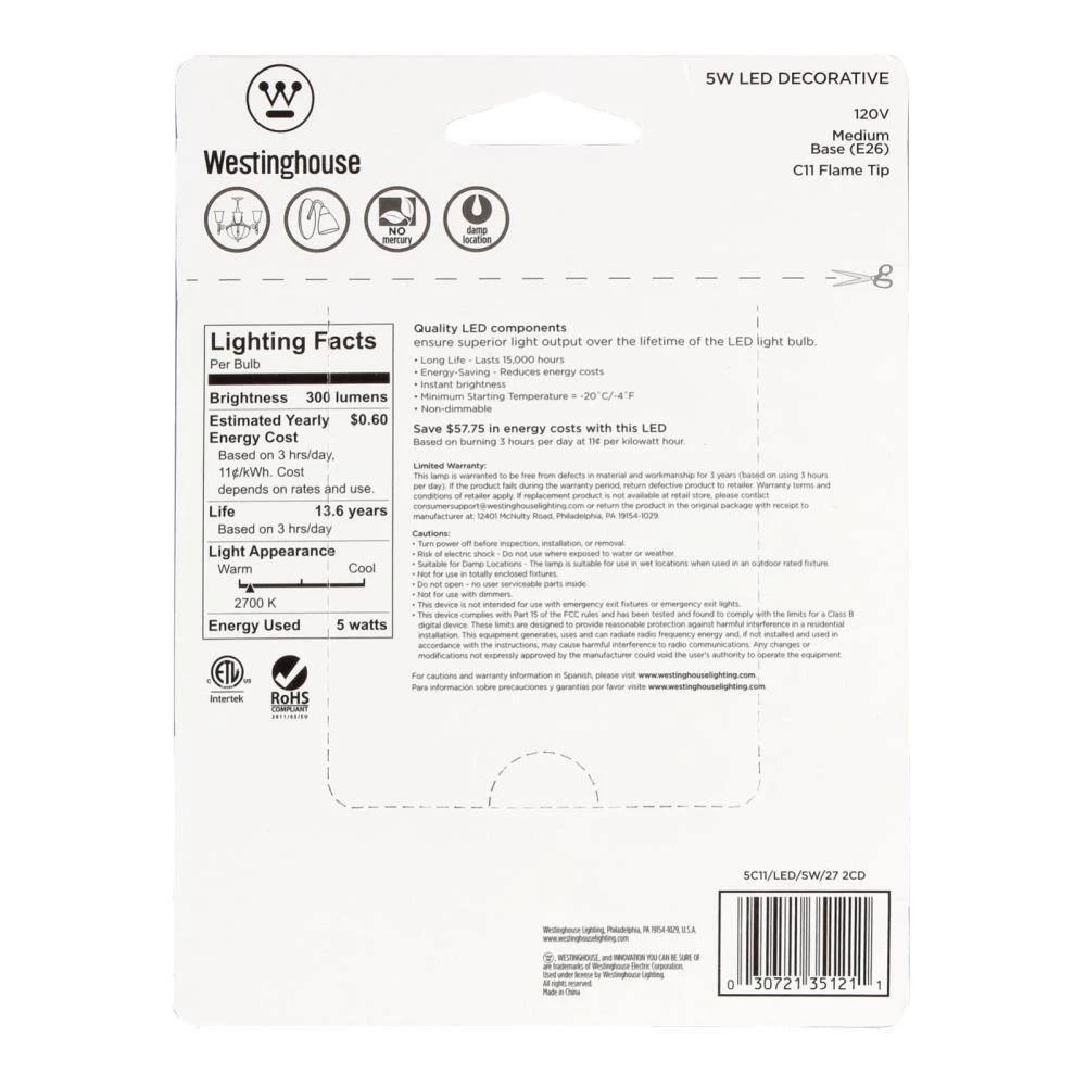 The Westinghouse 5-Watt C11 LED Light Bulb (2-Pack) is designed for use in decorative light fixtures. The ideal energy-saving replacement light bulb in chandeliers, sconces, outdoor rated porch and post lanterns. Reduce energy costs with this medium base LED and save up to $57.75 over the lifetime of the bulb when used in place of a standard 40-Watt incandescent. Making the switch to Westinghouse LED light bulbs provides significant energy saving benefits. Westinghouse is a trusted, global brand. Westinghouse knows lighting and offers products with exceptional quality, reliability and functionality. Product reference number 35121.