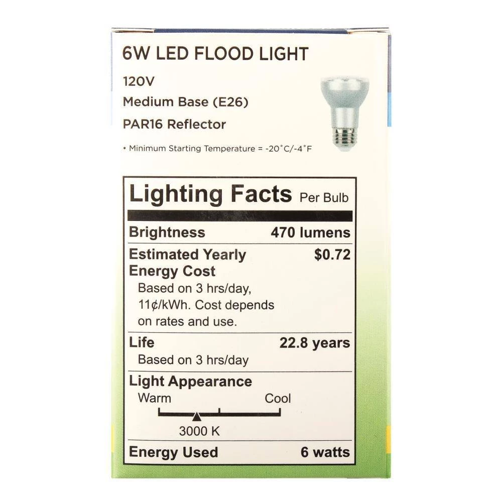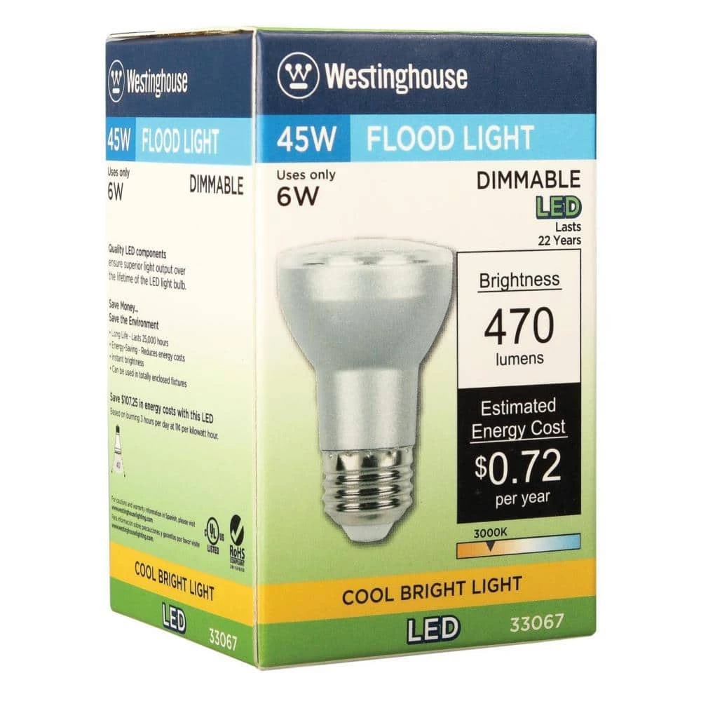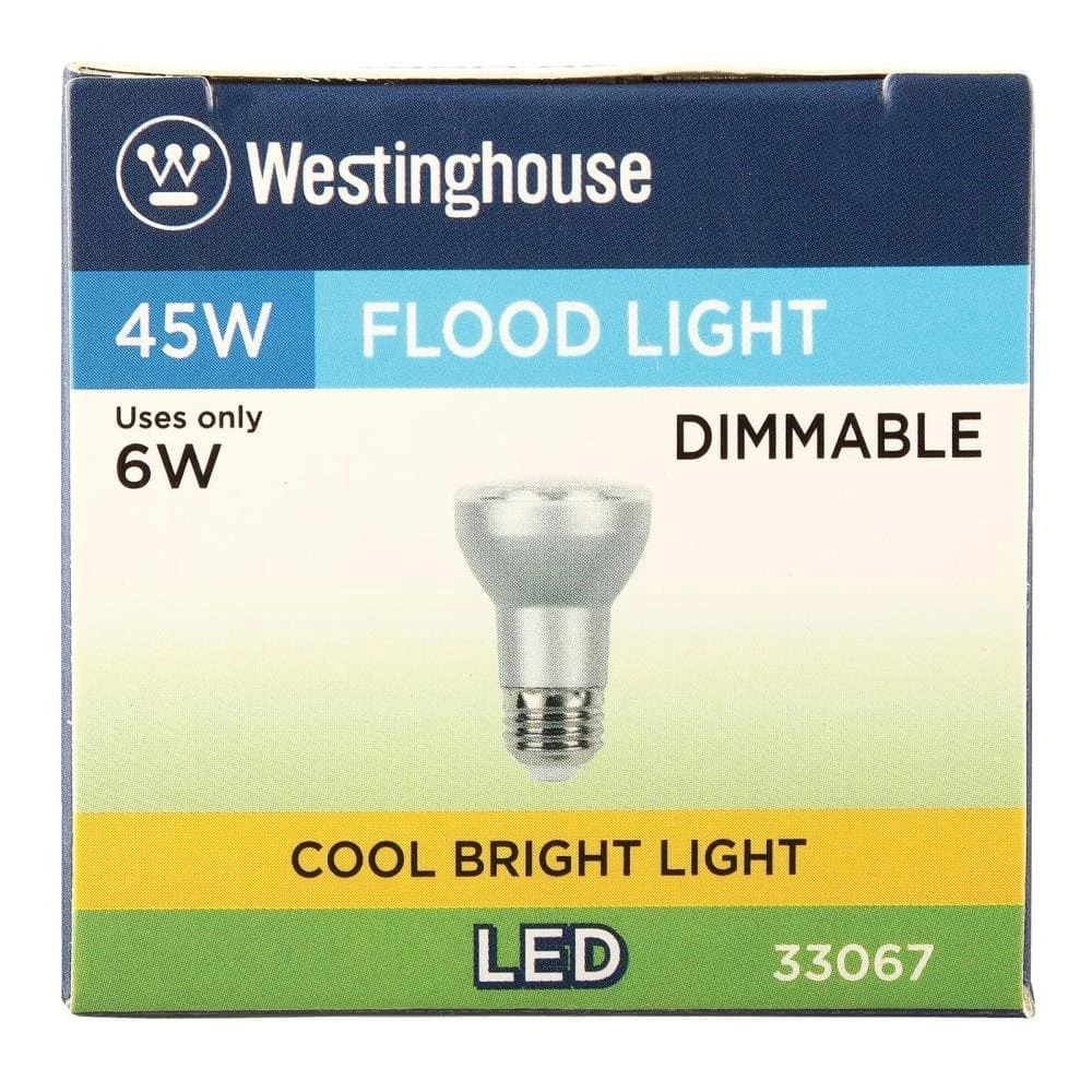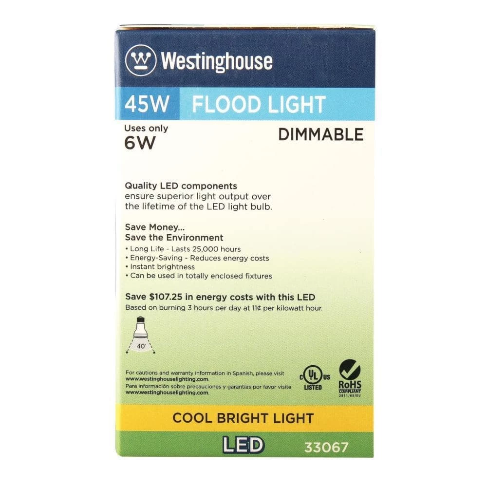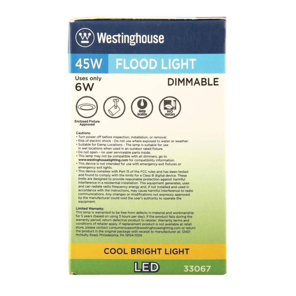 Westinghouse 6-Watt PAR16 Flood Dimmable LED Light Bulb is ideal for your task, accent, and general lighting needs. Perfect for everyday use, this LED provides exceptional brightness and long-lasting performance in track and recessed lighting. Approved for use in damp locations and enclosed fixtures, this energy-saving LED flood is a great choice for your outdoor recessed fixtures. Westinghouse PAR16 Flood LED light bulbs can reduce energy and operating costs, saving you $107.25 over the lifetime of the bulb compared to a standard 45-Watt incandescent bulb with the same brightness. Westinghouse is a trusted, global brand. Westinghouse knows lighting and offers products with exceptional quality, reliability and functionality. Product reference number 33067.