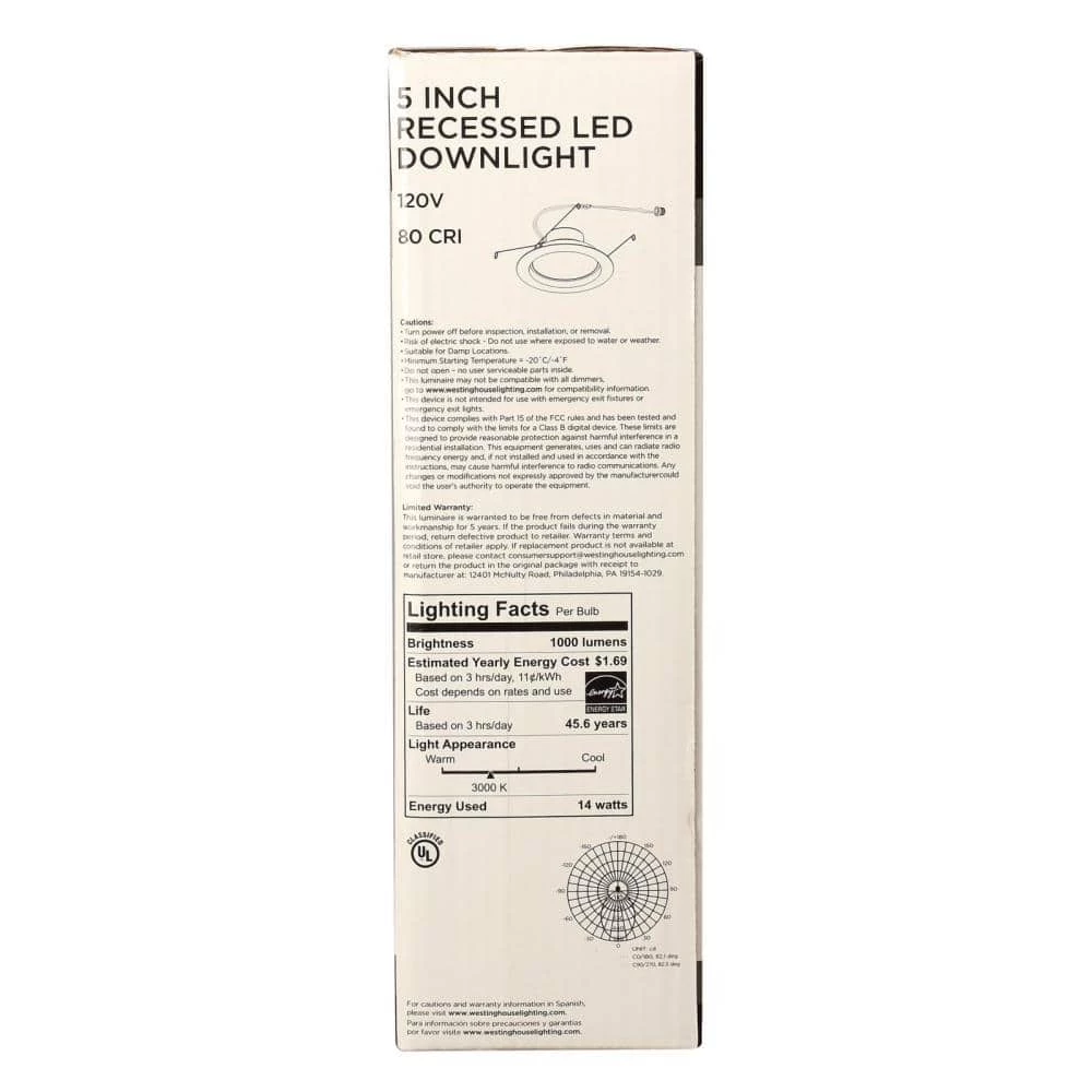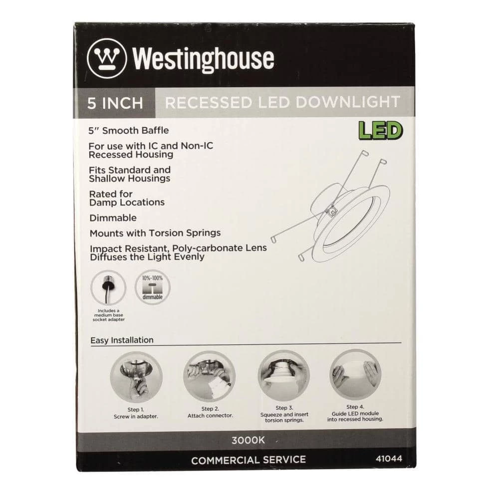 The 14-Watt ENERGY STAR Dimmable 5 in. White Recessed LED Downlight is ideal for everyday use. Simply replace the bulb in a 5 in. standard recessed housing with this LED downlight for a quick, easy and energy efficient upgrade. This durable LED light is suitable for damp locations and provides long-term use and dependability. It is perfect for kitchens, family rooms, offices, retail settings or anywhere recessed lighting is used. All installation hardware is hidden and the pre-attached trim creates a seamless look. Reduce energy costs with this ENERGY STAR LED and save up to $363 over the lifetime of the bulb when used in place of a standard 80-Watt incandescent. Making the switch to Westinghouse LED light bulbs provides significant energy saving benefits. Westinghouse is a trusted, global brand. Westinghouse knows lighting and offers products with exceptional quality, reliability and functionality. Product reference number 41044.