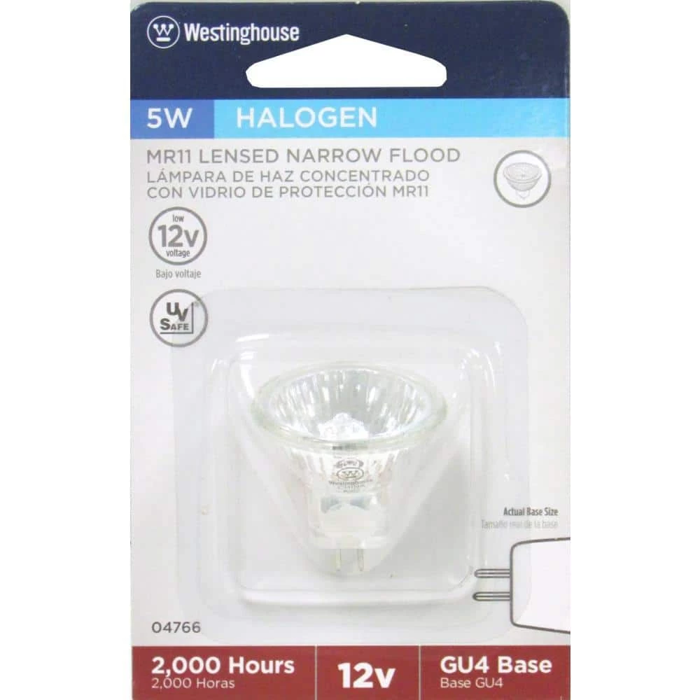 The Westinghouse 5-Watt MR11 12 Volt Low Voltage Clear Lens Halogen Light Bulb includes a GU4 base ideal for pendant and recessed lighting fixtures. Featuring bright white light, this halogen light is a cost-effective and low-energy option for home, office and outdoors. Westinghouse is a global brand with a simple philosophy: make life easier for everyone who buys its products. Westinghouse products are designed for exceptional quality, reliability, and functionality. Product reference number 04766.