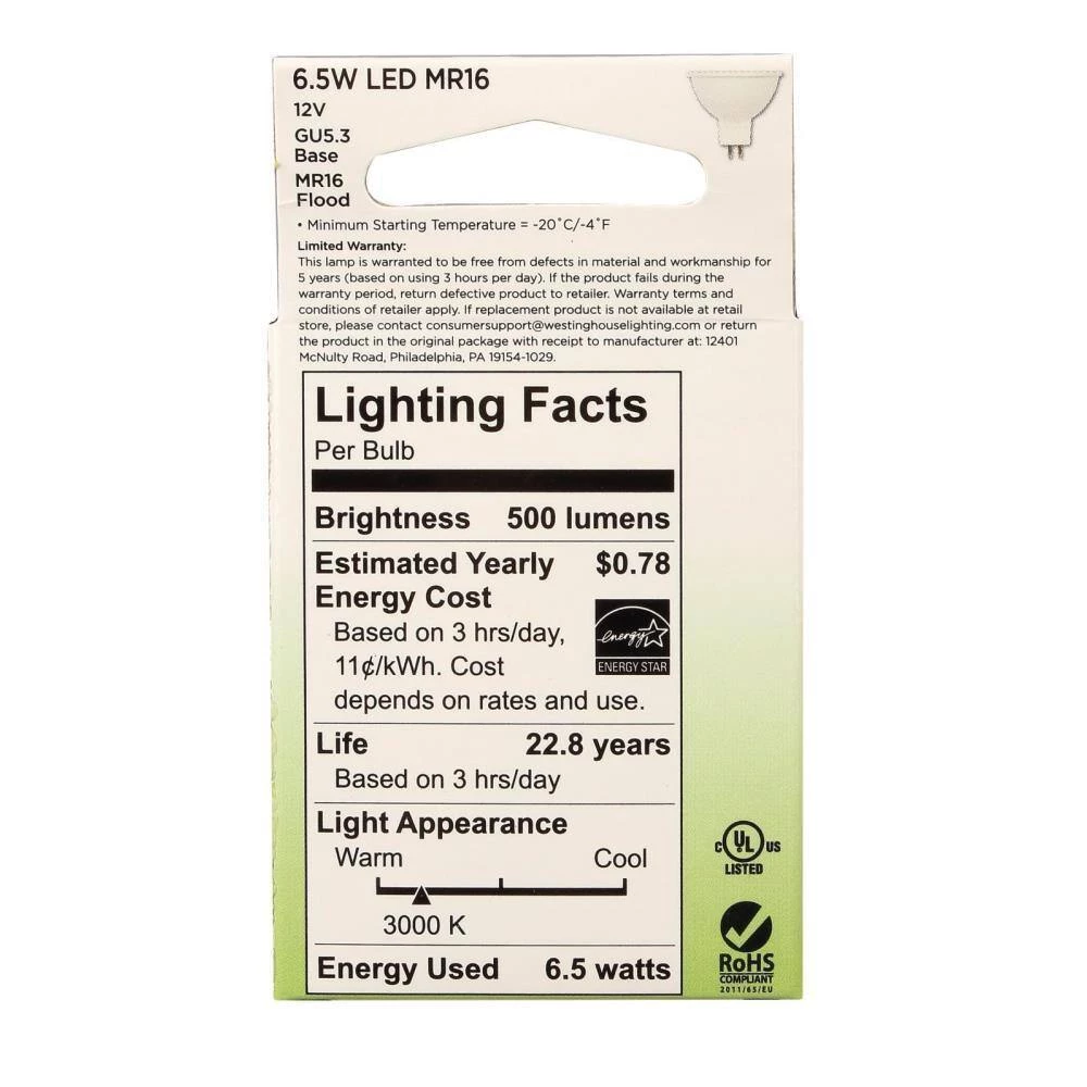 The Westinghouse 6-1/2-Watt MR16 LED Dimmable Light Bulb (6-Pack) is the ideal energy-saving replacement. Perfect for low voltage track and recessed light fixtures where task or accent lighting is important. This ENERGY STAR LED light bulb reduces energy and operating costs. Save up to $119.63 over the lifetime of the bulb compared to a standard 50-Watt halogen bulb. Making the switch to Westinghouse LED light bulbs provides significant energy saving benefits. Westinghouse is a trusted, global brand. Westinghouse knows lighting and offers products with exceptional quality, reliability and functionality. Product reference number 33491.