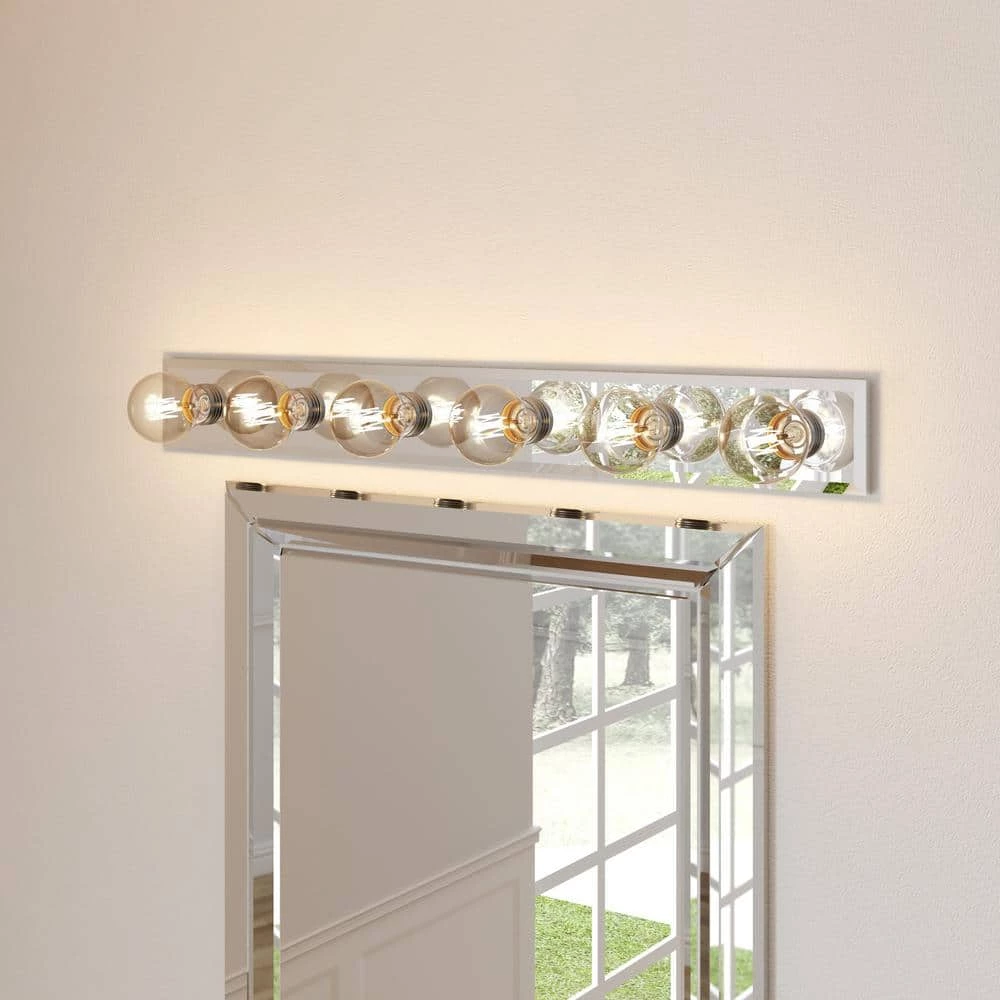 If you need a streamlined, contemporary fixture to light your bathroom, this Westinghouse 6-light interior bath bar is an ideal solution. The fixture provides enough light for large spaces, and the reflective beveled mirror provides extra brightness. The bar measures 4-1/4 in. by 36 in. (H x W) and extends 6-1/4 in. from the wall with bulbs installed (3-1/4 in. without bulbs). It is slender enough to fit easily between a mirrored cabinet and ceiling. The fixture uses 6 medium-base light bulbs, 100-Watt maximum (not included). This Westinghouse interior wall fixture is UL listed for safety. It is backed by a 5-year limited manufacturer’s warranty against defects in materials and workmanship. Westinghouse is a trusted, global brand. Westinghouse knows lighting and offers products with exceptional quality, reliability and functionality. Product reference number 66450.