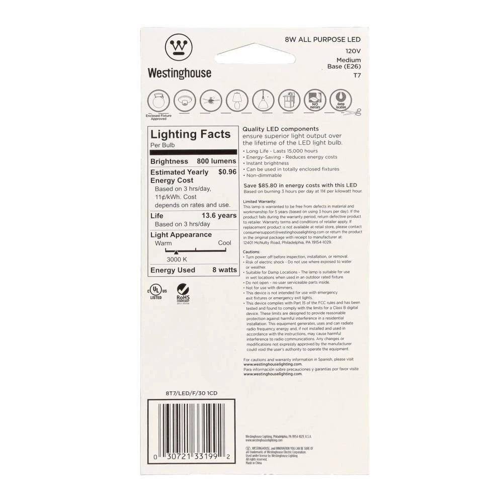 The Westinghouse 8-Watt T7 LED Light Bulb is ideal for use in low profile fanlights and fixtures where a regular household bulb may not fit. Also ideal for use in table and floor lamps and pendants. Suitable for use in damp locations such as outdoor fixtures and can be used in enclosed fixtures. Not for use with dimmers. This T7 LED reduces energy costs up to 87%. Save up to $94.88 over the 13-year lifetime of the bulb when compared to a standard 60-Watt incandescent. LEDs are free of harmful mercury making them a great choice for your replacement needs. Making the switch to Westinghouse LED light bulbs provides significant energy saving benefits. Westinghouse is a trusted, global brand. Westinghouse knows lighting and offers products with exceptional quality, reliability and functionality. Product reference number 33199.