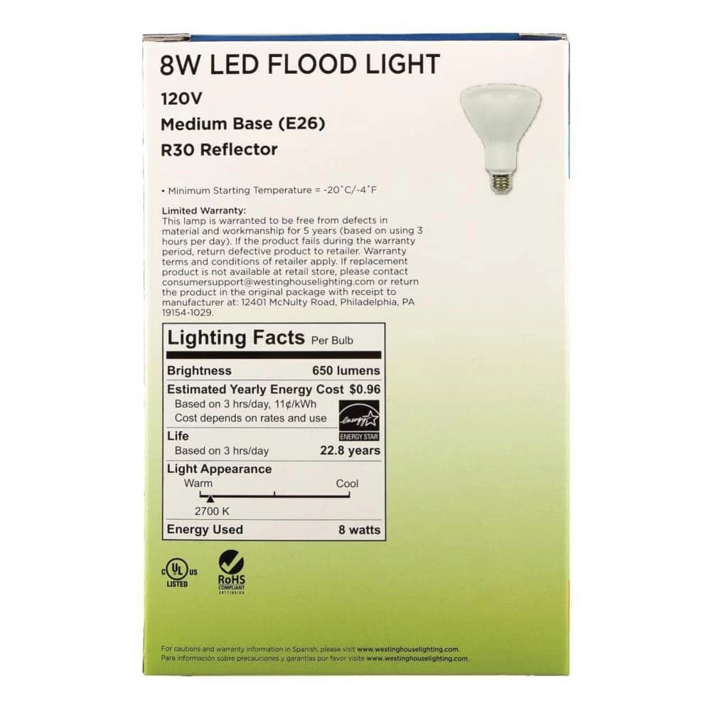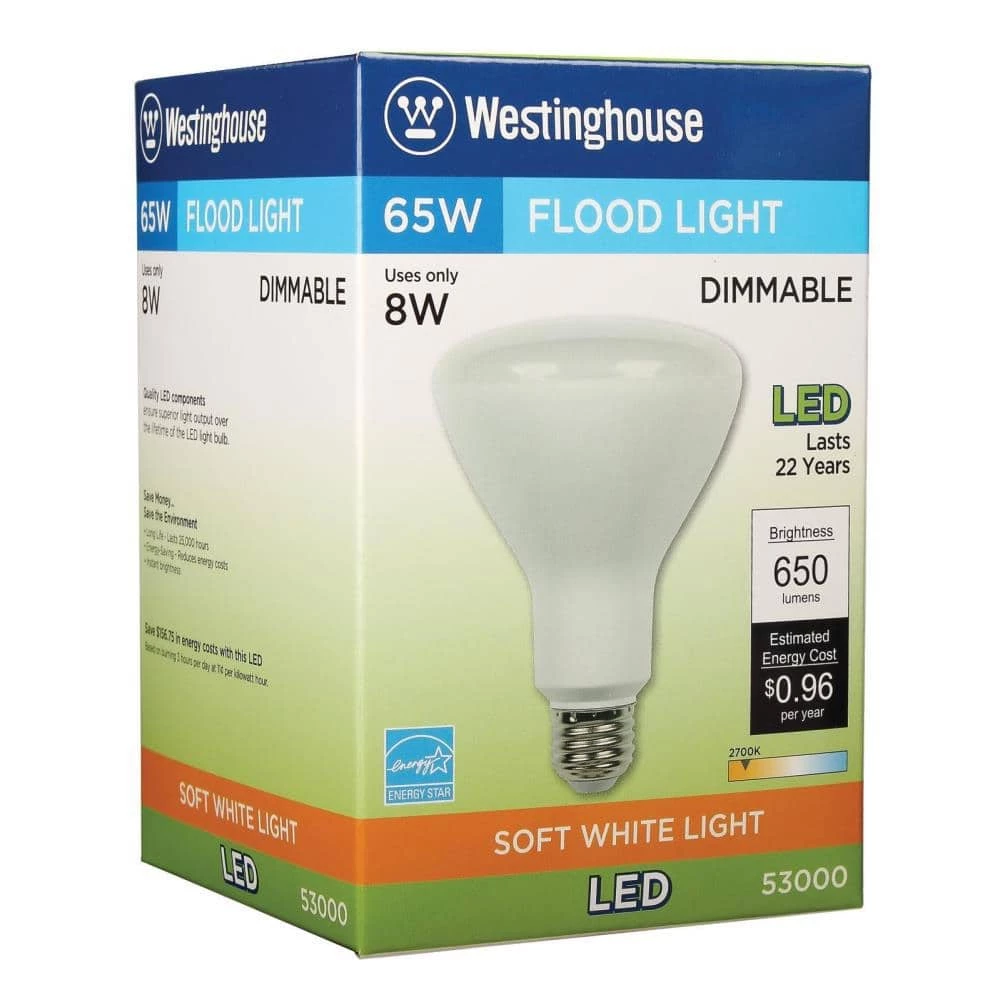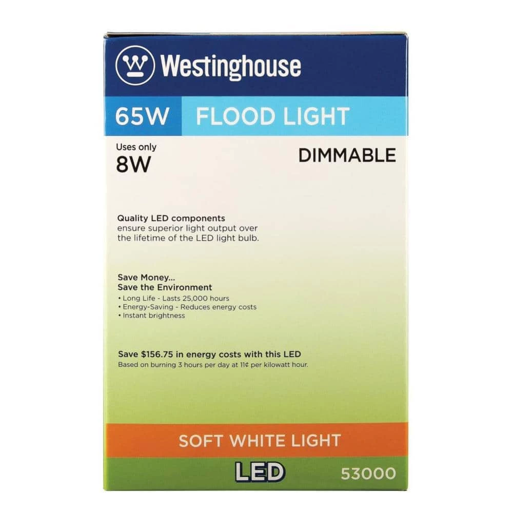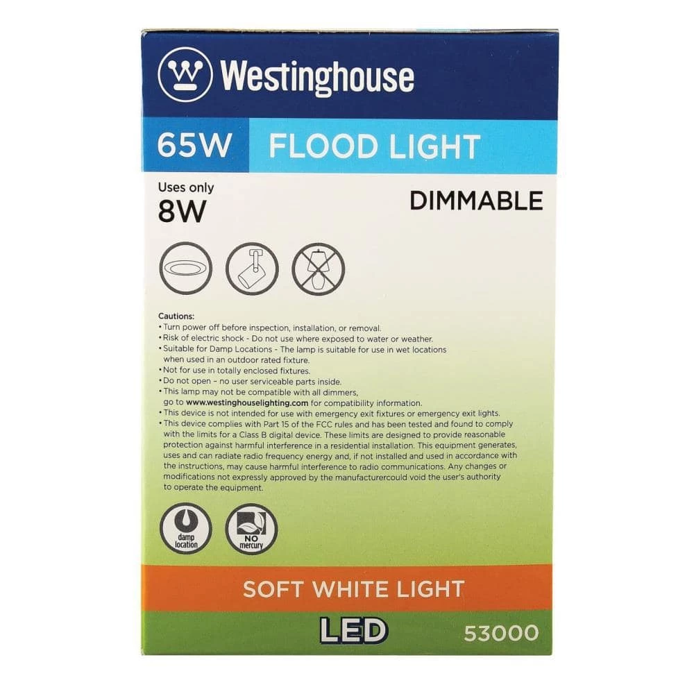 Westinghouse 8-Watt R30 Flood Dimmable LED Light Bulb is ideal for your task, accent, and general lighting needs. Perfect for everyday use, this LED provides soft white light and long-lasting performance in track and recessed lighting It is also suitable for your outdoor recessed fixtures. Westinghouse R30 Flood LED light bulbs can reduce energy and operating costs, saving you 88 percent over the lifetime of the bulb compared to a standard 65-Watt incandescent bulb with the same brightness. Westinghouse is a trusted, global brand. Westinghouse knows lighting and offers products with exceptional quality, reliability and functionality. Product reference number 53000.