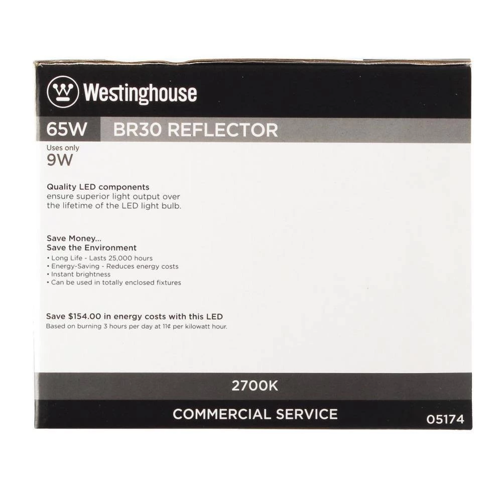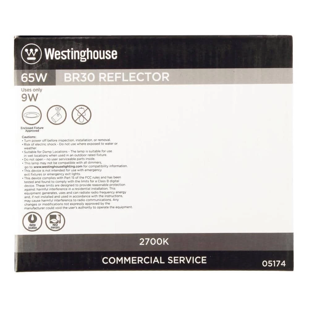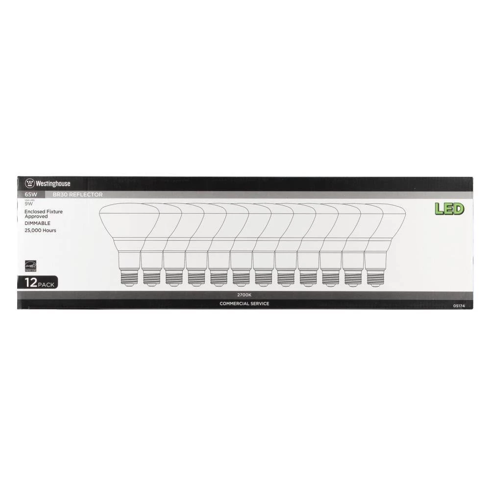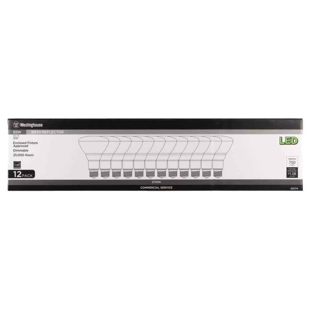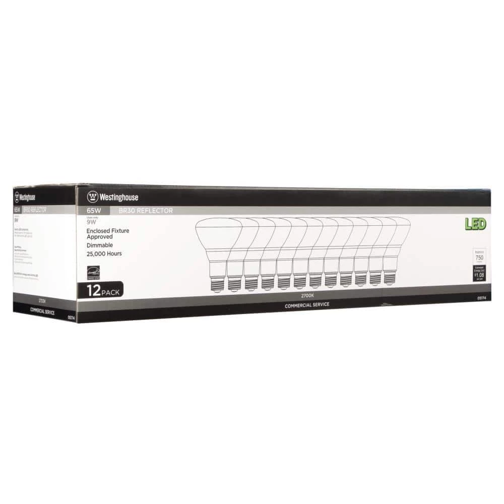 The Westinghouse 9 Watt BR30 LED Dimmable Light Bulb (12-Pack) is the ideal energy-saving replacement for incandescent reflector bulbs. Perfect for track and recessed light fixtures where task or accent lighting is important. Each of these BR30 LEDs reduces energy costs, saving up to 86% over the lifetime of the bulb compared to a standard 65-watt incandescent. Making the switch to Westinghouse LED light bulbs provides significant energy saving benefits. Westinghouse is a trusted, global brand. Westinghouse knows lighting and offers products with exceptional quality, reliability and functionality. Product reference number 05174.