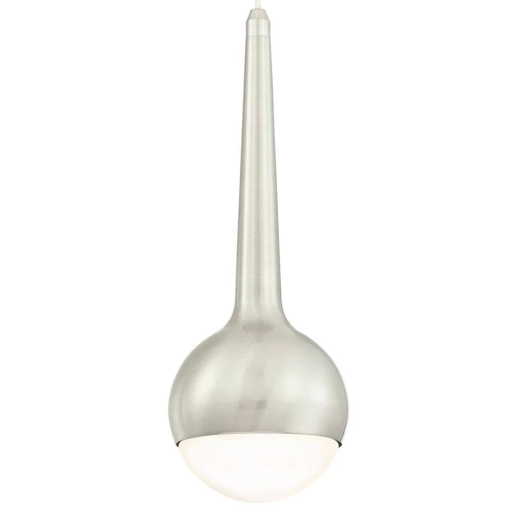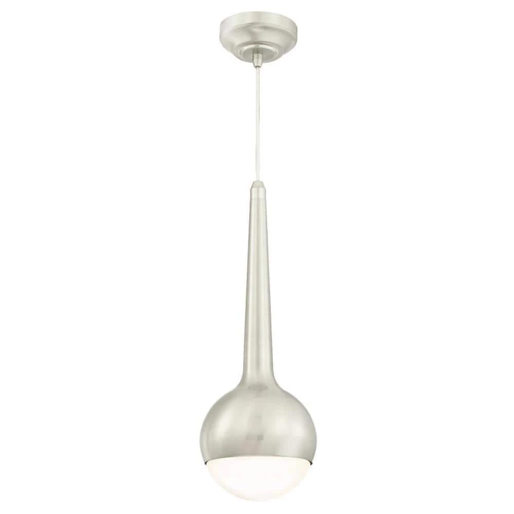 Eye-catching style and technology combine in this simple teardrop design 1-Light Mini Pendant, providing illumination with energy-efficient LED light. The elegant lines of this pendant are enhanced with a brushed nickel finish and simple frosted opal glass. This distinctive one-light mini pendant will add style to your space when suspended in multiples above a kitchen island or in a dining area, bedroom or bathroom. The dimmable one-light mini pendant will provide long-lasting illumination. The 7-1/2-watt integrated LED in this fixture will provide beautiful ambient light for many years and you will never need to replace a single bulb. The pendant measures 71-9/16 in. x 6-11/16 in. (H x D), 50 inches adjustable cord length. Westinghouse is a trusted, global brand. Westinghouse knows lighting and offers products with exceptional quality, reliability and functionality. Product reference number 63297.