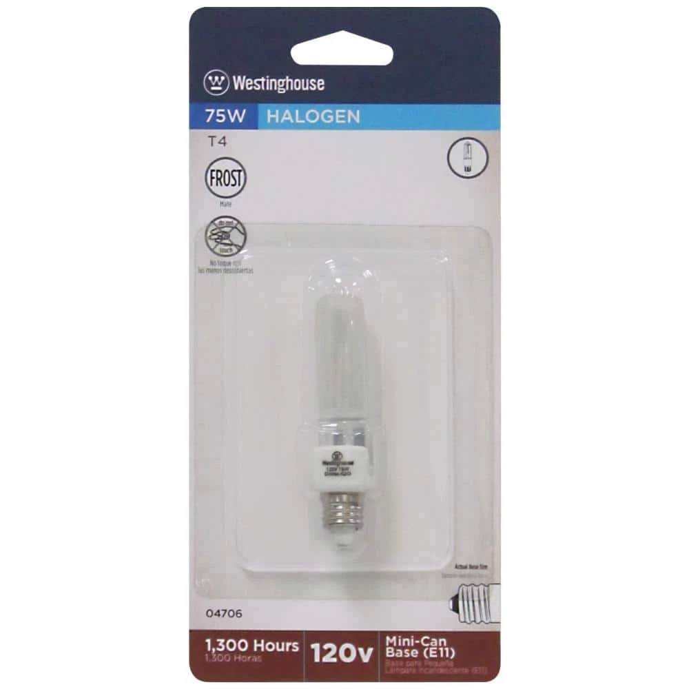 The Westinghouse 75-Watt T4 Single-Ended Frost Halogen Light Bulb includes a Mini-Can Base ideal for pendant lighting, decorative fixtures, ceiling fans, table lamps, and more. This halogen light provides bright white light to home, office and outdoors. Westinghouse is a global brand with a simple philosophy: make life easier for everyone who buys its products. Westinghouse products are designed for exceptional quality, reliability, and functionality. Product reference number 04706.