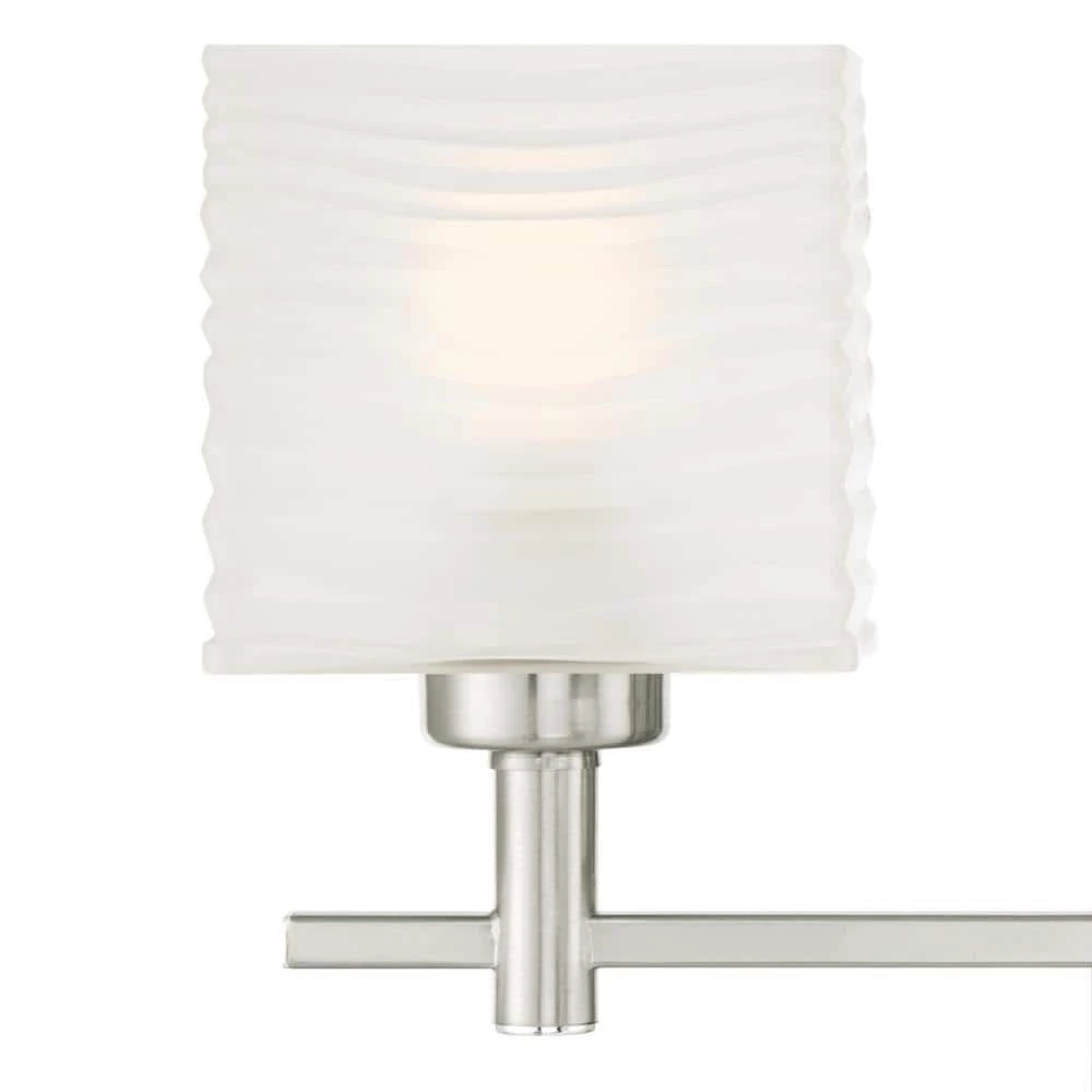 The Alexander 3-Light Wall Fixture is distinguished by its unique patterned glass and clean lines. This contemporary fixture features an elegant brushed nickel finish and rippled white glazed glass shades. Install this wall fixture in the bathroom or over a vanity for stunning style and beautiful illumination. Position the fixture up or down to suit your needs. The wall fixture measures 11-1/8 in. x 22-1/2 in. (H x W) and extends 5-7/8 in. from the wall. This Westinghouse indoor wall fixture is ETL/CETL listed for safety. It is backed by a 5-year limited manufacturer’s warranty against defects in materials and workmanship. Product reference number 63040.