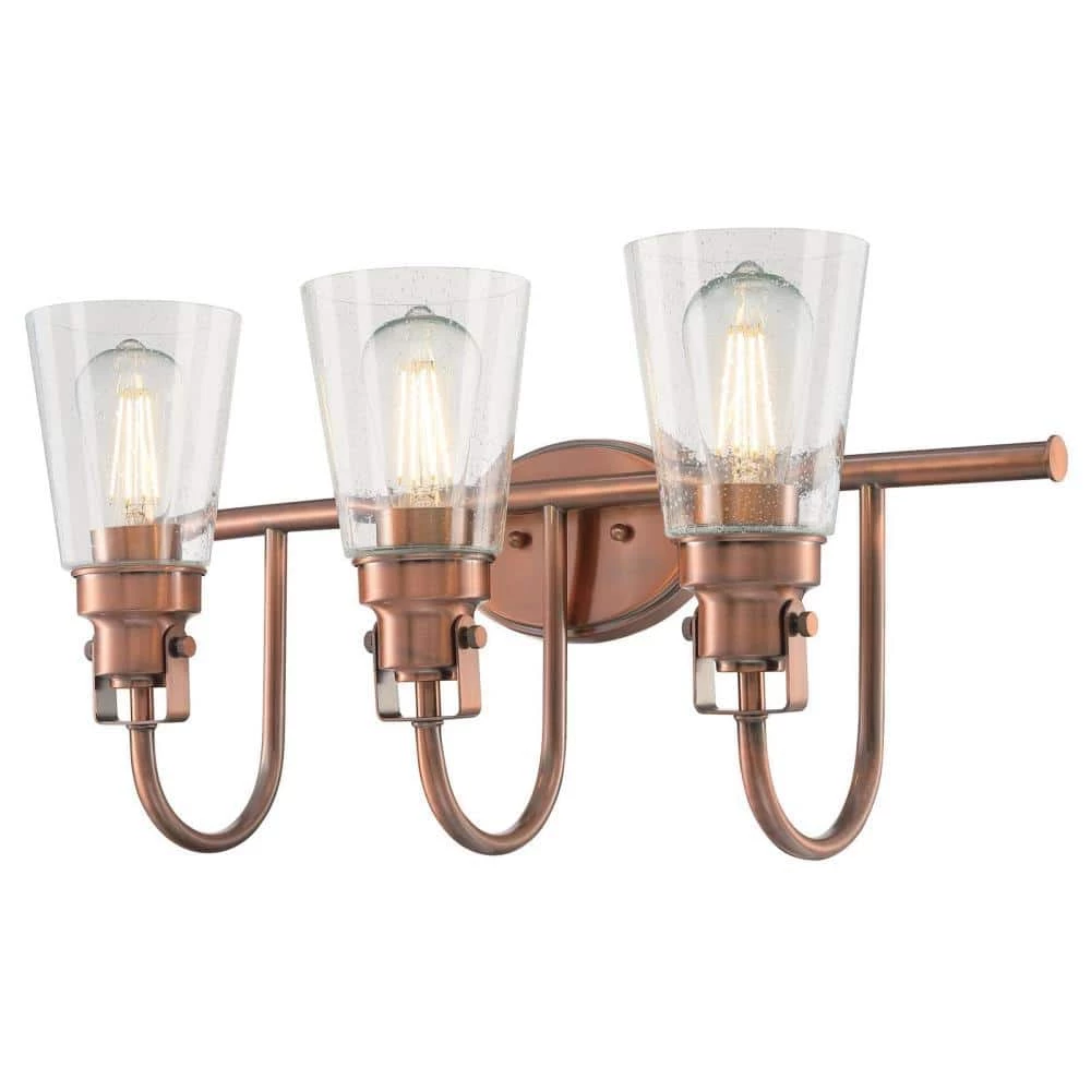 A great addition to any space, the Westinghouse Ashton wall fixture features classic style with industrial details. Washed copper finish and clear seeded glass suit many modern decor styles, from vintage-industrial to farmhouse. Install this bathroom vanity light in a powder room, in a dressing room or bedroom for adequate task lighting. The wall fixture measures 12 in. x 24 in. (H x W), extends 8-3/4 in. from the wall and back plate 4-1/2 in. x 6-15/16 in. (H x W).Westinghouse is a trusted, global brand. Westinghouse knows lighting and offers products with exceptional quality, reliability and functionality. Product reference number 65748.