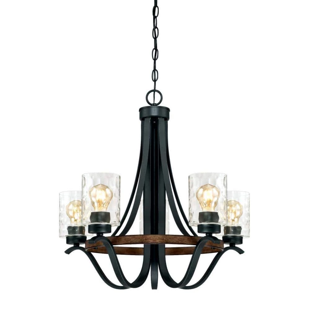 The vintage charm of the Barnwell 5-Light Chandelier stems from the mixture of textures and finishes. The warmth of the barnwood band combined with the rustic textured iron finish, and hand blown hammered glass shades will make any room feel extraordinary. Add a warm radiant glow in a foyer or living room, over a dining room table or kitchen island, in homes with styles from vintage to farmhouse. Westinghouse is a trusted, global brand. Westinghouse knows lighting and offers products with exceptional quality, reliability and functionality. Product reference number 63319.