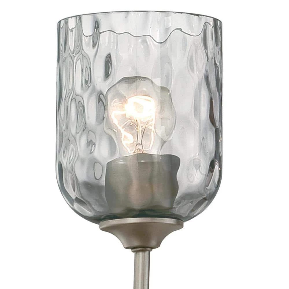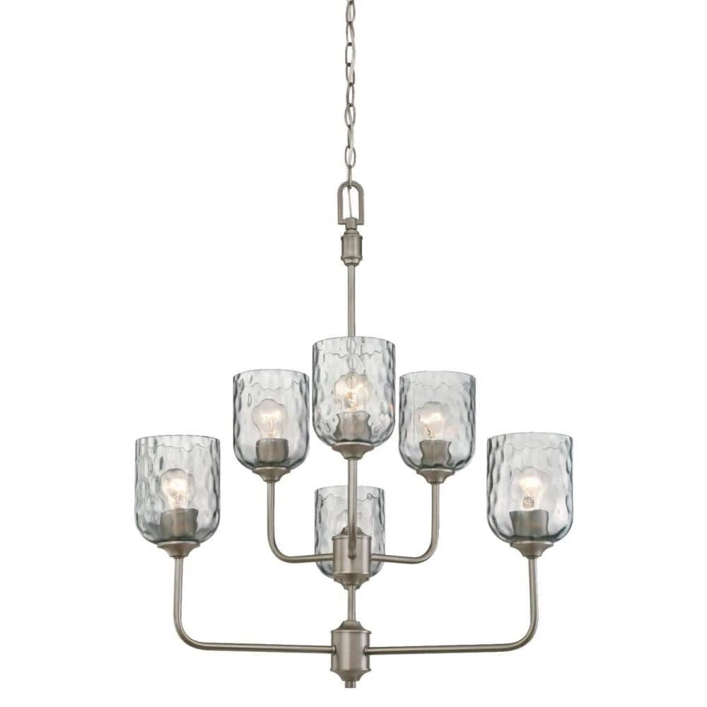 The contemporary design of the Basset Six-Light Chandelier offers an intriguing style with a hint of elegance. Dark pewter finish with eye-catching two-tier grouping of hand blown smoke grey hammered glass adds a romantic glow. Add a beautiful centerpiece to a foyer or great room with high ceilings, over a large dining room table or kitchen island, in an open concept living area or loft. The chandelier measures 30-3/8 in. x 27-15/16 in. (H x D), chain 36 in. long, cord is 60 in. long.Backed by a 5-year limited manufacturer’s warranty against defects in materials and workmanship. Westinghouse is a trusted, global brand. Westinghouse knows lighting and offers products with exceptional quality, reliability and functionality. Product reference number 63263.