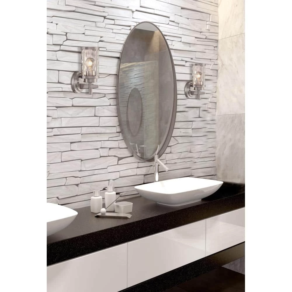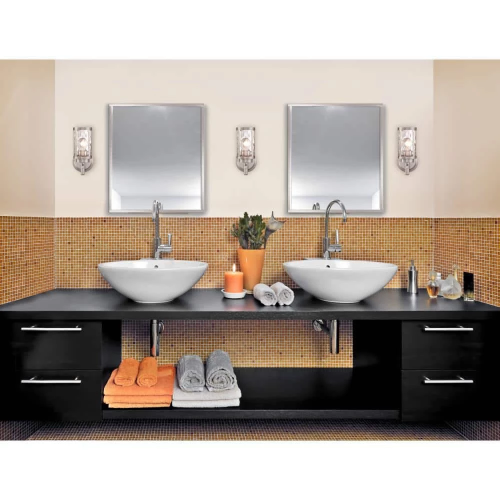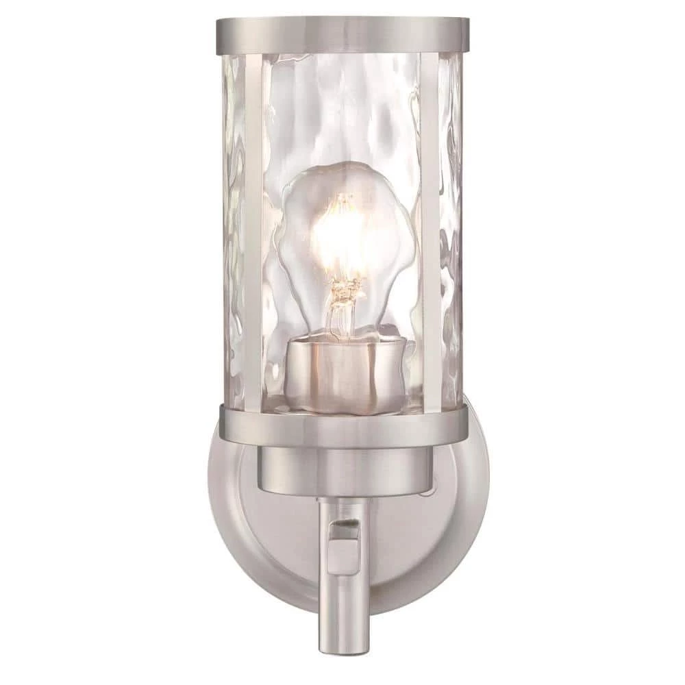 Bring the shimmering illumination of the Westinghouse Branston wall fixture to any contemporary space. Finished in brushed nickel with clear, softly rippled water glass, adds a modern touch to a transitional design. Install this wall fixture in the bathroom, over a vanity or in pairs, to highlight a focal point over your mantle. The wall fixture measures 10-9/16 in. x 4-15/16 in. (H x W), extends 5-1/2 in. from the wall and back plate 4-15/16 in. D. Westinghouse is a trusted, global brand. Westinghouse knows lighting and offers products with exceptional quality, reliability and functionality. Product reference number 63683.
