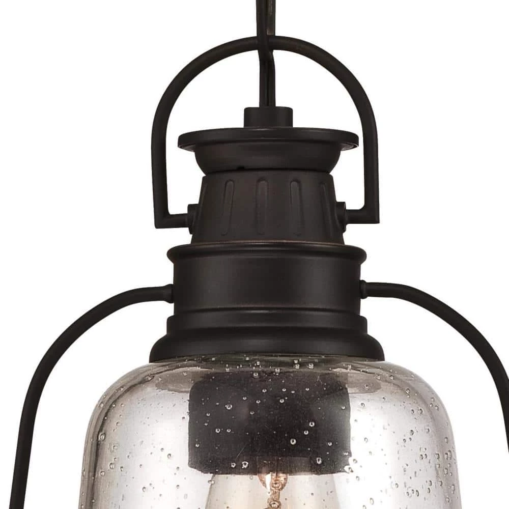 Welcome visitors with the inviting glow of the Westinghouse Brynn Outdoor Pendant. This traditional pendant design casts a warm glow, featuring clear seeded hand blown glass. The oil rubbed bronze finish is hand-rubbed to highlight the fixture’s design features. Decorate your front or back entryway, porch or balcony with this outdoor pendant light. This Westinghouse hanging pendant light is ETL/CETL listed for safety. It is backed by a 5-year manufacturer’s warranty against defects in materials and workmanship. Westinghouse is a trusted, global brand. Westinghouse knows lighting and offers products with exceptional quality, reliability and functionality. Product reference number 63399.