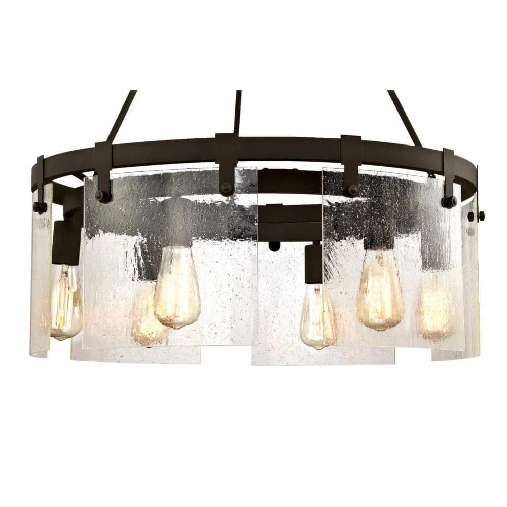 Bring the distinctive look of the Westinghouse 6-Light Burnell Chandelier into any setting, from vintage to modern. Circular bands finished in oil rubbed bronze and curved seeded glass panels add a halo of ambiance over a dining or kitchen table. Add this chandelier in a foyer or living room, over a large dining room table or kitchen island for instant ambiance. The chandelier measures 29 in. x 26 in. (H x D), chain length 36 in. , cord length 60 in. , maximum hanging length 67-3/4 in. , can be installed on sloped ceilings. Westinghouse is a trusted, global brand. Westinghouse knows lighting and offers products with exceptional quality, reliability and functionality. Product reference number 63522.