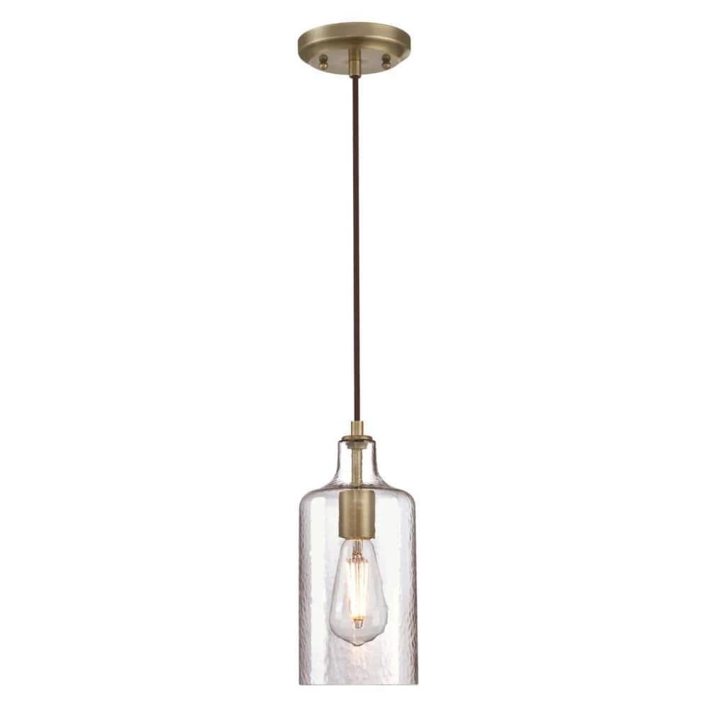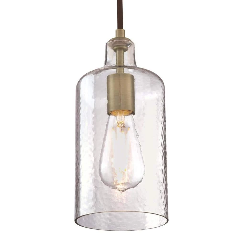 - Antique brass mini pendant with clear textured glass shade adds vintage appeal