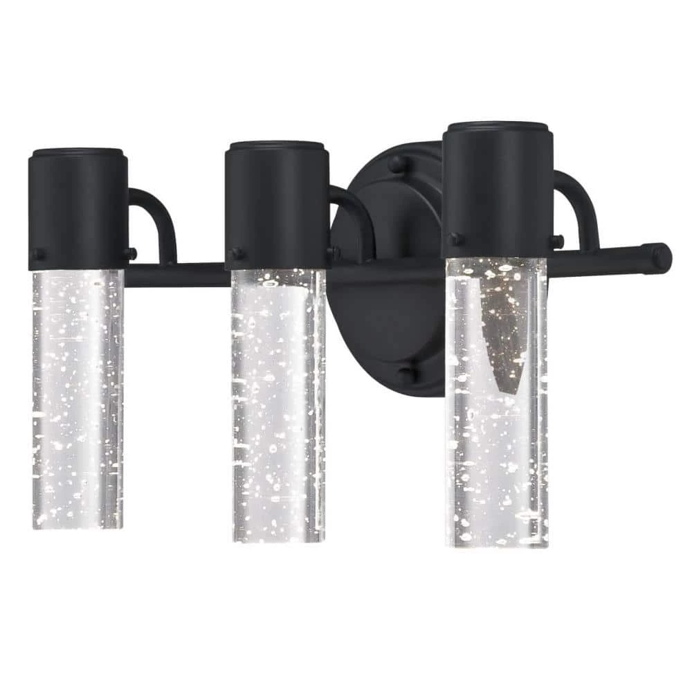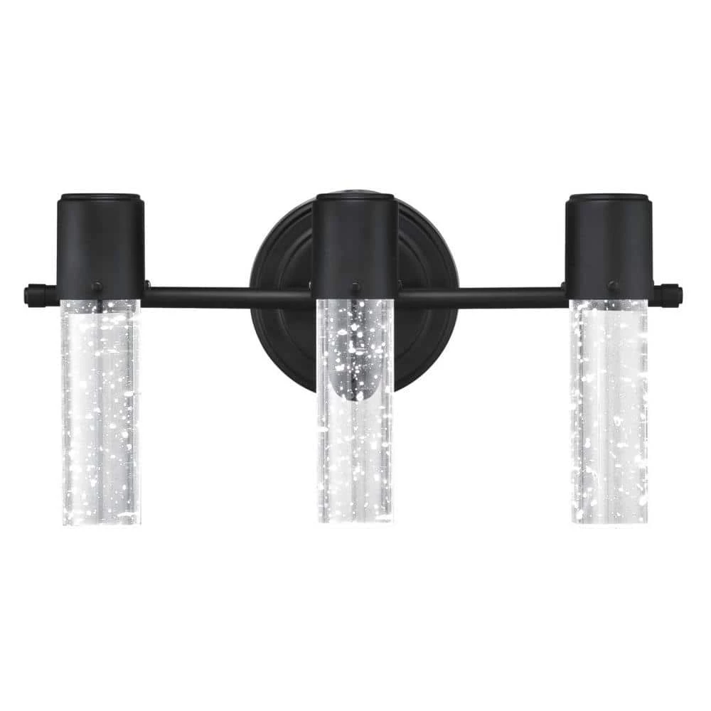 Unique, solid cylinder bubble glass illuminates with dazzling LED light, the Westinghouse Cava wall fixture fuses captivating style and technology. Enhanced with an elegant matte black finish, this glamorous 3-light wall fixture will energize any space, from bathrooms, dressing rooms to bedrooms. The dimmable 3-light wall fixture is long-lasting, will provide-years of bright light. Using only 22-Watt of energy, the integrated LED provides beautiful task or ambient light equivalent to 120-Watt or three 40-watt incandescent light bulbs. And, you will never need to replace a single bulb. The wall fixture measures 7-3/4 in. x 15-1/8 in. (H x W) and extends 5-11/16 in. from the wall. Backed by a 5-year limited manufacturer’s warranty against defects in materials and workmanship. Westinghouse is a trusted, global brand. Westinghouse knows lighting and offers products with exceptional quality, reliability and functionality. Product reference number 63725.