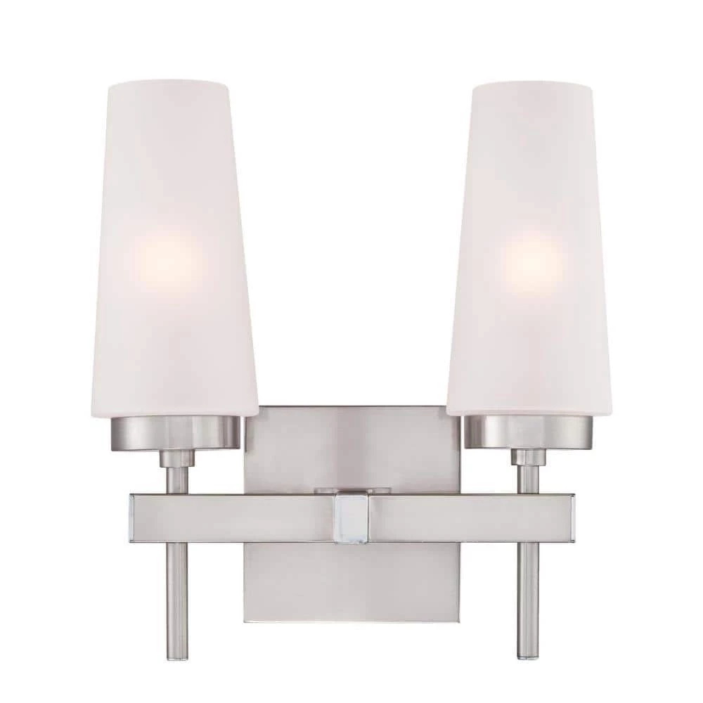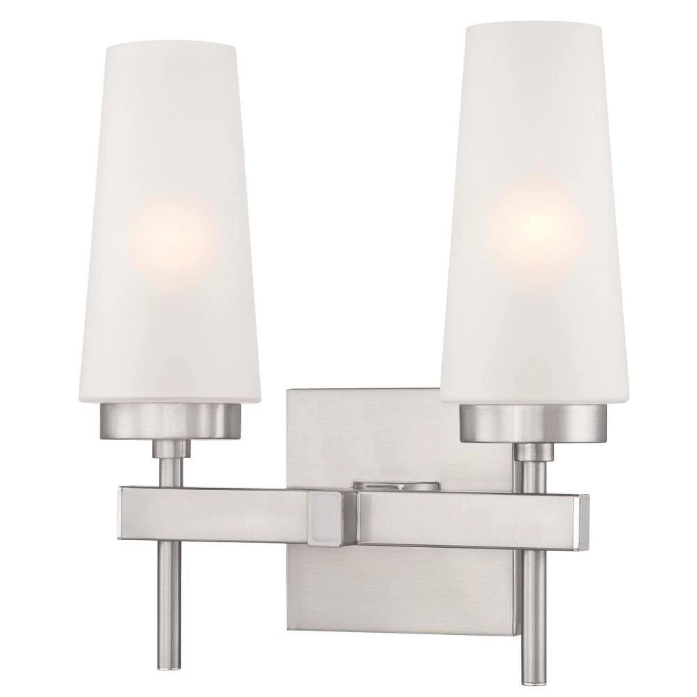 The Westinghouse Chaddsford 2-Light Wall Fixture brings elegant, sophisticated style to your home. Resembling frosted glass flutes atop elongated stems, the Chaddsford is brightly finished in a brushed Nickel finish. This wall fixture’s design complements traditional or contemporary settings with sparkling illumination. Add this contemporary wall fixture in the bathroom, over vanity or in a dining room for a touch of ambience. The wall fixture measures 13-7/8 in. x 12-7/16 in. (H x W), extends 5-15/16 in. from the wall and back plate 5-1/2 in. x 5-1/2 in. (H x W). Westinghouse is a trusted, global brand. Westinghouse knows lighting and offers products with exceptional quality, reliability and functionality. Product reference number 63533.