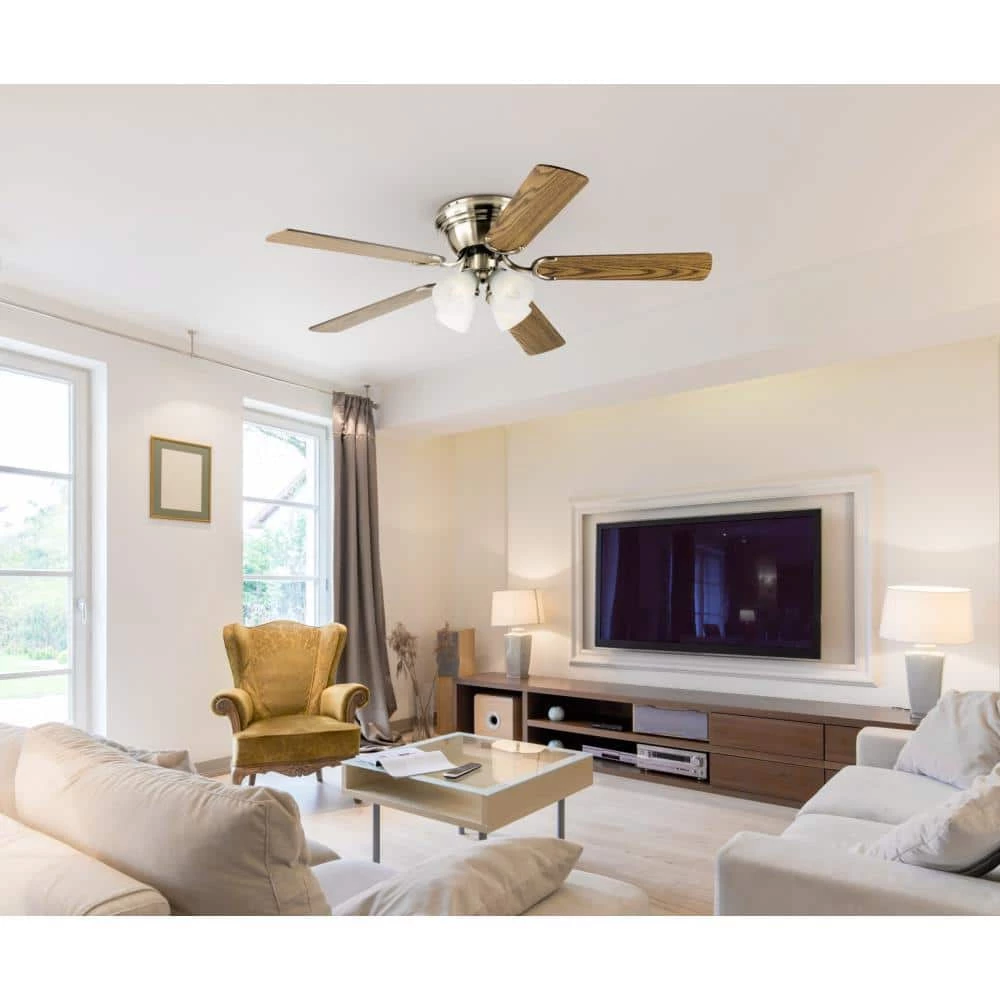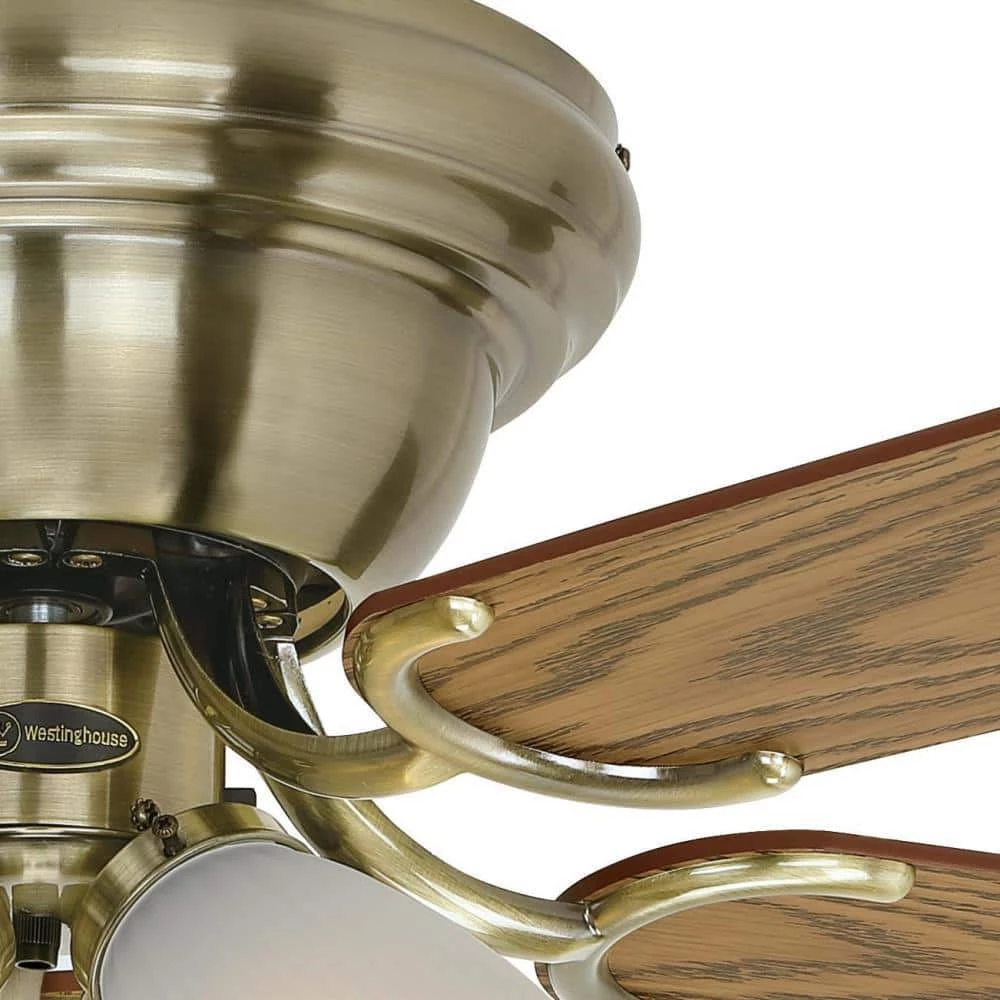 Brighten any room with the classic style of the Westinghouse Contempra IV indoor ceiling fan. The antique brass finish brings charming appeal to the traditional flush mount ceiling fan design. Reversible blades in complementary wood finishes of oak and walnut are an elegant touch in traditional and contemporary rooms. The energy-efficient light kit includes frosted ribbed glass shades and 4 candelabra base, 4.5-Watt B11 dimmable LED light bulbs for long-lasting brightness. The Contempra IV ceiling fan adds style and year-round comfort to large rooms with low ceilings. Westinghouse ceiling fans are backed by a lifetime warranty on the motor and a 2-year warranty on all other parts. Westinghouse is a trusted, global brand. Westinghouse knows lighting and offers products with exceptional quality, reliability and functionality. Product reference number 72322.