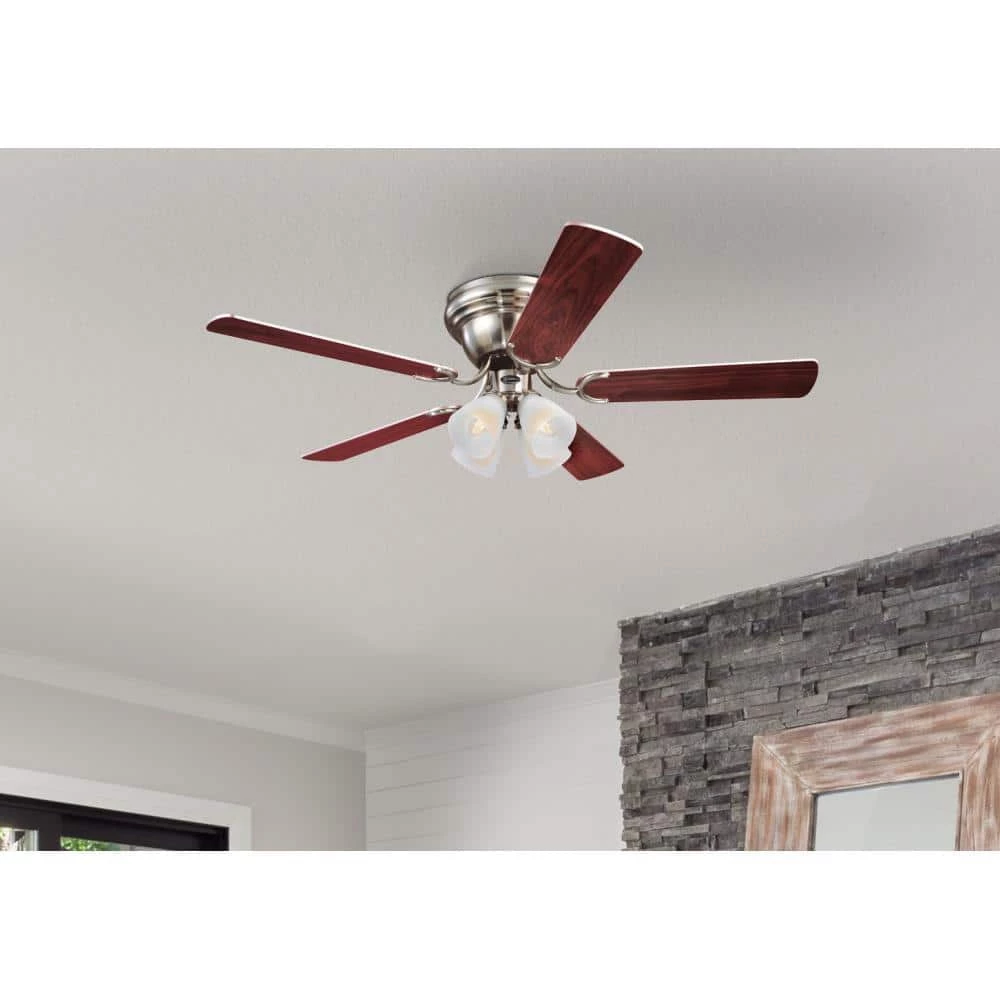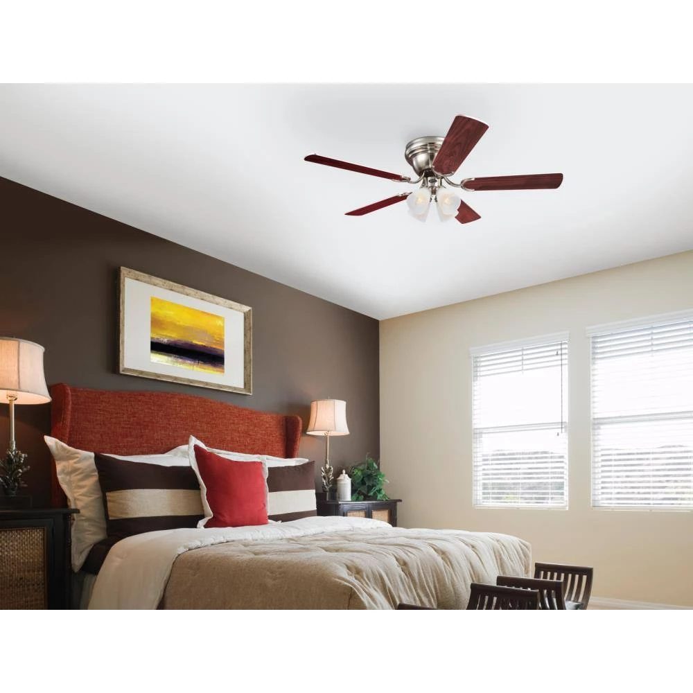 Brighten any room with the classic style of the Westinghouse Contempra IV indoor ceiling fan. The brushed nickel finish brings sleekness to the traditional flush mount ceiling fan design. Reversible blades in complementary wood finishes of rosewood and bird’s eye maple are an elegant touch in traditional and contemporary rooms. The energy-efficient light kit includes frosted ribbed glass shades and 4 candelabra base, 4.5-Watt B11 dimmable LED light bulbs for long-lasting brightness. The Contempra IV ceiling fan adds style and year-round comfort to large rooms with low ceilings. Westinghouse ceiling fans are backed by a lifetime warranty on the motor and a 2-year warranty on all other parts. Westinghouse is a trusted, global brand. Westinghouse knows lighting and offers products with exceptional quality, reliability and functionality. Product reference number 72320.