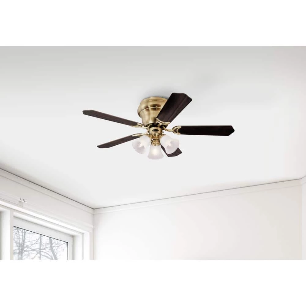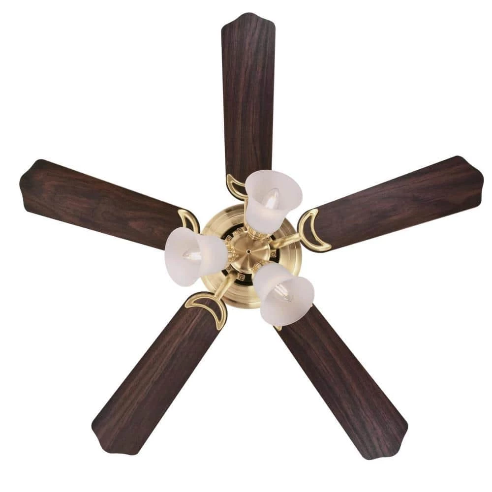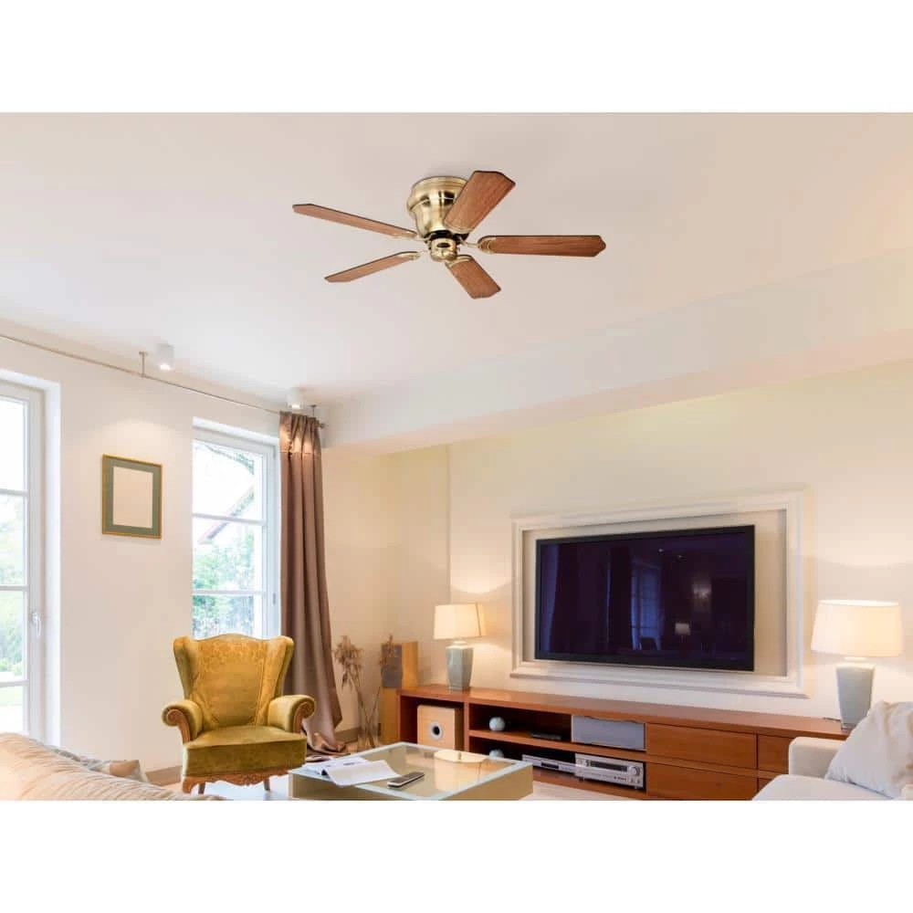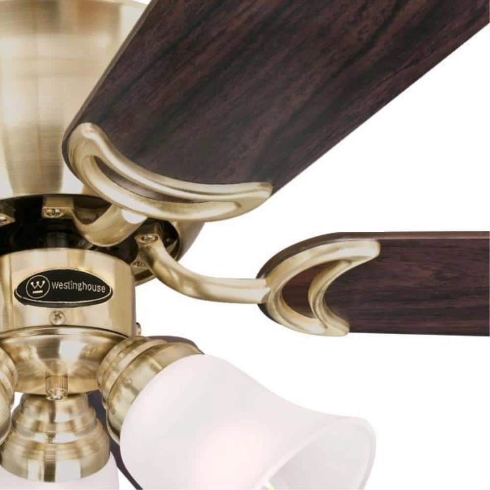 Brighten any room with the classic style of the Westinghouse Contempra Trio indoor ceiling fan. The satin brass finish brings luster to the traditional flush mount ceiling fan design. Reversible blades in complementary wood finishes of walnut and maple are an elegant touch in traditional and contemporary rooms. The energy-efficient light kit includes frosted glass shades and 3 candelabra base, 4.5-Watt B11 dimmable LED light bulbs for long-lasting brightness. The Contempra Trio ceiling fan adds style and year-round comfort to small rooms with low ceilings. Westinghouse ceiling fans are backed by a lifetime warranty on the motor and a 2-year warranty on all other parts. Westinghouse is a trusted, global brand. Westinghouse knows lighting and offers products with exceptional quality, reliability and functionality. Product reference number 72315.