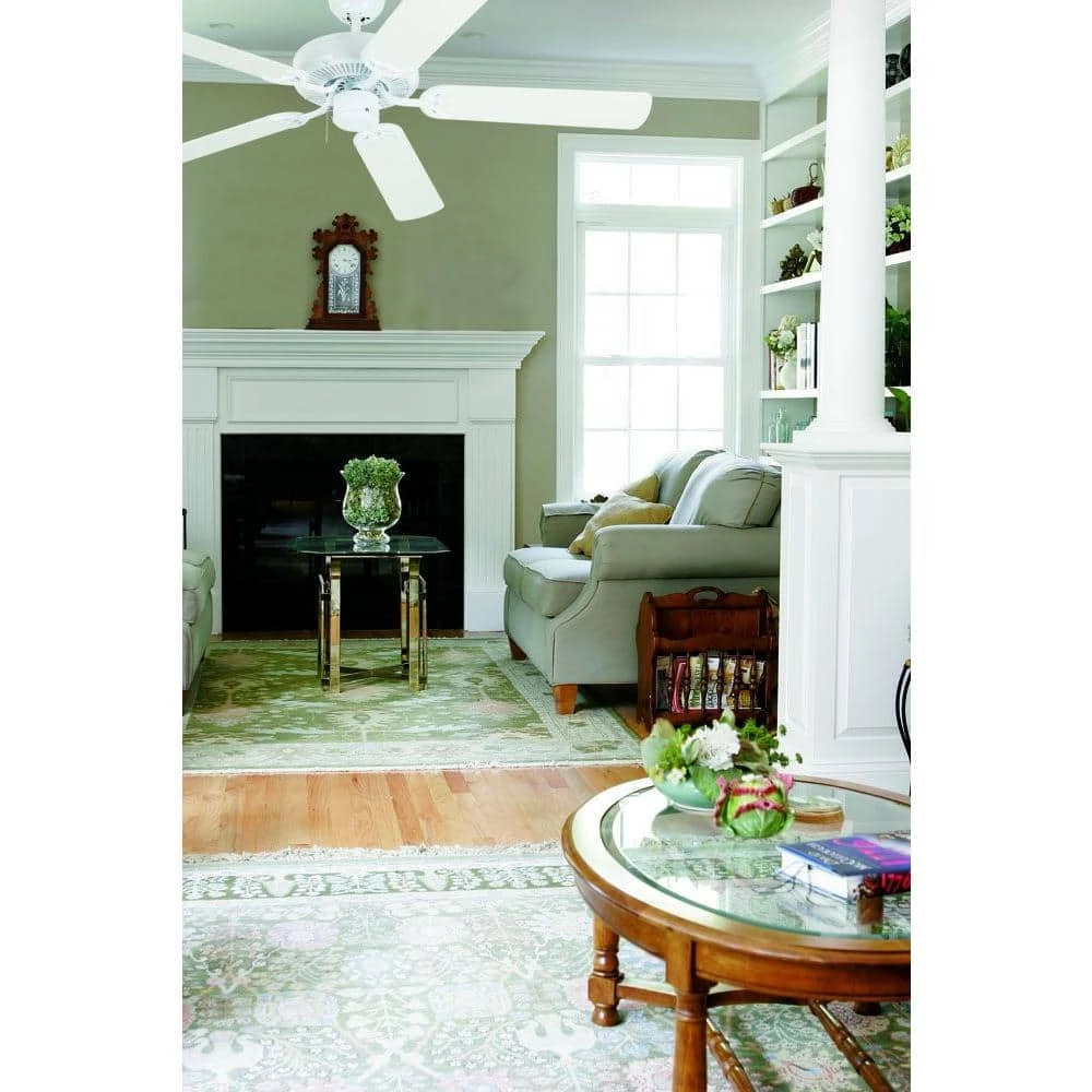 Rich in its gleaming white finish and 5 white blades, this Westinghouse Contractor’s Choice 52 in. indoor ceiling fan will add convenient comfort and reliable performance to any room. Ideal for rooms up to 360 sq. ft. (18 x 20 ft.) with standard 8 ft. ceilings, this fan features a 153 mm x 15 mm silicon steel motor with a triple capacitor for powerful, quiet air circulation. Three fan speeds (high/medium/low) and a reversible switch help keep you comfortable all year-round. The ceiling fan provides airflow of up to 4,099 CFM. It is rated to operate at 65-Watt at high speed (without lights), which gives it an airflow efficiency rating of 63 CFM/watt. (As a comparison, 49- to 60 in. ceiling fans have airflow efficiencies ranging from approximately 51 to 176 CFM/watt at high speed). This Contractor’s Choice is remote control adaptable and comes with everything you need for installation, including a 3/4 in. x 4 in. (D x L) down rod and 78 in. lead wire. It is backed by a lifetime motor warranty and a 2-year warranty on all other parts. Product reference number 78024.