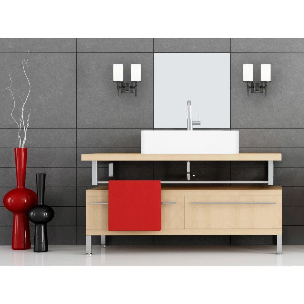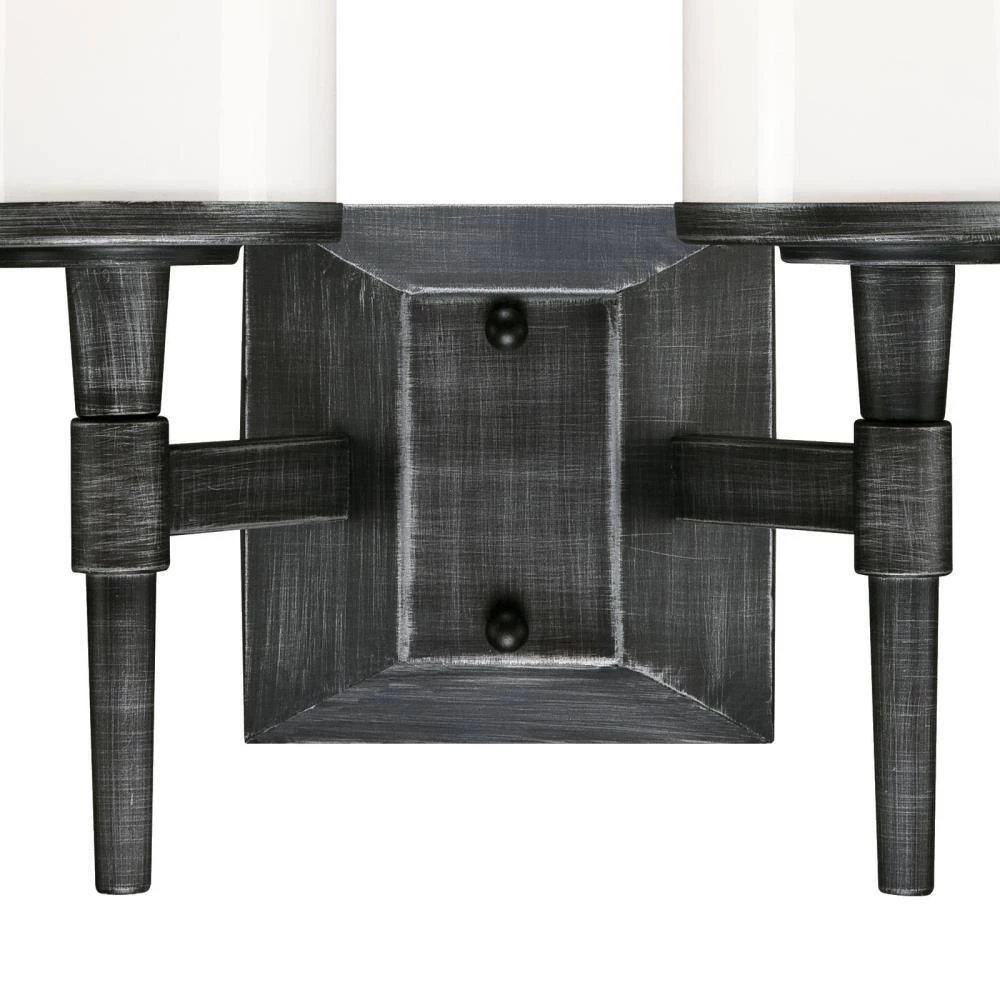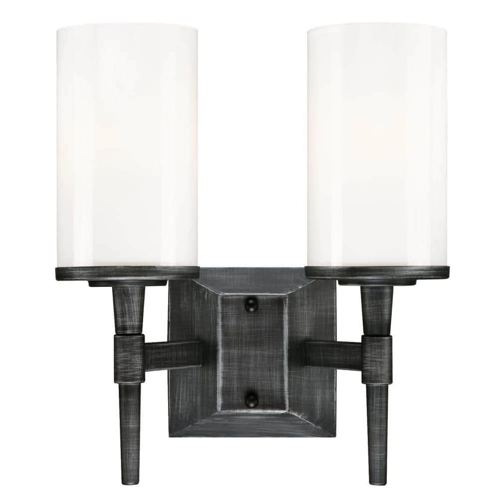 The understated Courtfield 2-Light Wall Fixture is distinguished by its hand applied finish and elegant design. The distressed aluminum finish adds depth and dimension while the hand blown white opal cylinders provide beautiful illumination. Install this wall fixture the bathroom, over a vanity or in a dining room for a touch of ambience. The wall fixture measures 12-9/16 in. x 11-1/8 in. (H x W), extends 5-11/16 in. from the wall and back plate 4-5/16 in. x 4-15/16 in. (H x W). This Westinghouse indoor wall fixture is ETL/CETL listed for safety. It is backed by a 5-year limited manufacturer’s warranty against defects in materials and workmanship. Product reference number 63249.