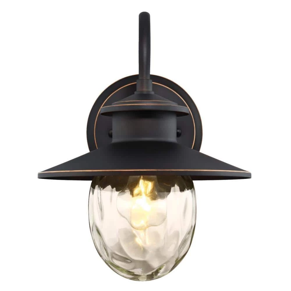 Make a welcoming statement to visitors with the inviting glow of the Westinghouse Delmont Outdoor Wall Fixture. The clear water glass shade adds a shimmering touch to this fixture. The oil rubbed bronze finish is hand-rubbed to highlight the design features of this rustic arts & crafts wall fixture. Decorate your front or back entryway with this outdoor wall light. Install next to a garage door, porch, or balcony. This Westinghouse wall mount fixture is ETL/CETL listed for safety. It is backed by a 5-year manufacturer’s warranty against defects in materials and workmanship. Westinghouse is a trusted, global brand. Westinghouse knows lighting and offers products with exceptional quality, reliability and functionality. Product reference number 63131.
