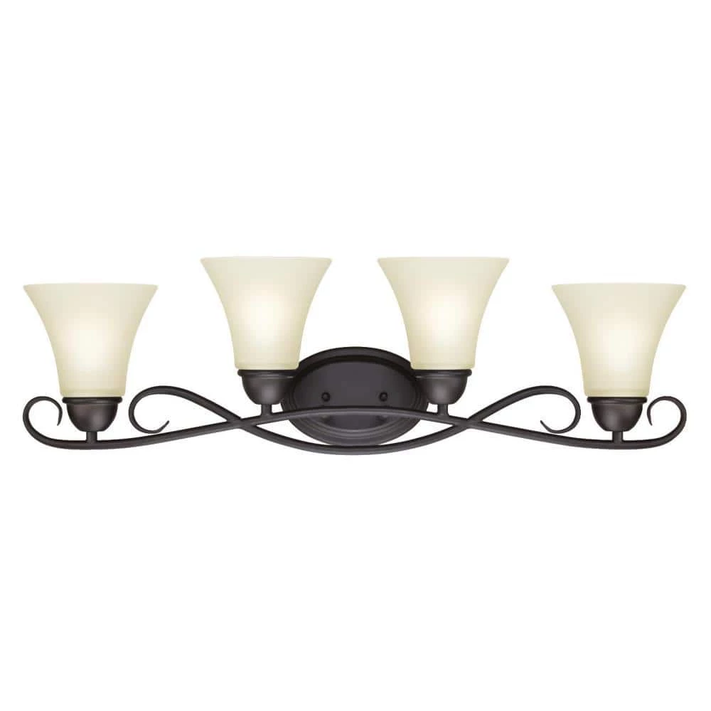 The Dunmore 4-Light Wall Fixture will add a luxurious traditional touch to your home with its graceful silhouette. This lovely fixture features rich oil rubbed bronze finish and 4 frosted glass shades that will create a beautiful display of light. Install this wall fixture in the bathroom, over double sinks or large vanities where additional lighting is desired. The frosted glass shades diffuse light perfectly for tasks and ambience. Position the fixture up or down to suit your needs. The wall fixture measures 9-1/4 in. x 31-1/2 in. (H x W) and extends 7-1/2 in. from the wall. This Westinghouse indoor wall fixture is ETL/CETL listed for safety. It is backed by a 5-year limited manufacturer’s warranty against defects in materials and workmanship. Westinghouse is a trusted, global brand. Westinghouse knows lighting and offers products with exceptional quality, reliability and functionality. Product reference number 63070.