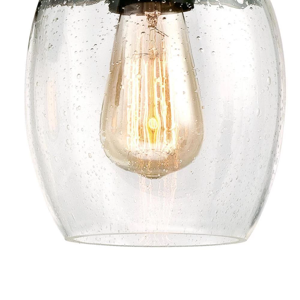 - Oil rubbed bronze finish with highlights and hand blown clear seeded glass shades
